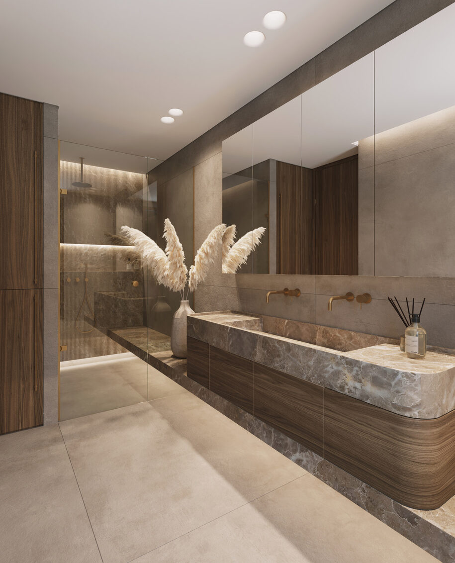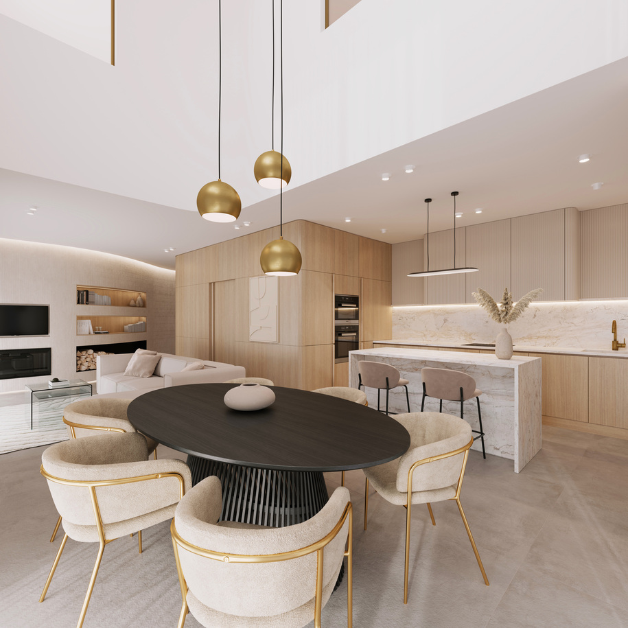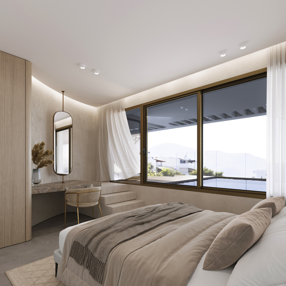 Η λειτουργικότητα και η βέλτιστη ροή αποτελούν καθοριστικά γνωρίσματα της εσωτερικής διακόσμησης, ενώ οι καθαρές γεωμετρίες, οι αδιάκοποι όγκοι, οι μεγάλες επιφάνειες από υλικά υψηλής ποιότητας, καθώς και οι χώροι διπλού ύψους, ενισχύουν την αίσθηση ευρυχωρίας και πολυτέλειας. Η φαινομενική, αλλά και ρεαλιστική σύνδεση με τις πισίνες μέσω των μεγάλων ανοιγμάτων και της ανεμπόδιστης θέας στη φύση που διασφαλίζει την ιδιωτικότητα πίσω από το «κέλυφος» του κτιρίου, απογειώνουν την εμπειρία διαβίωσης.