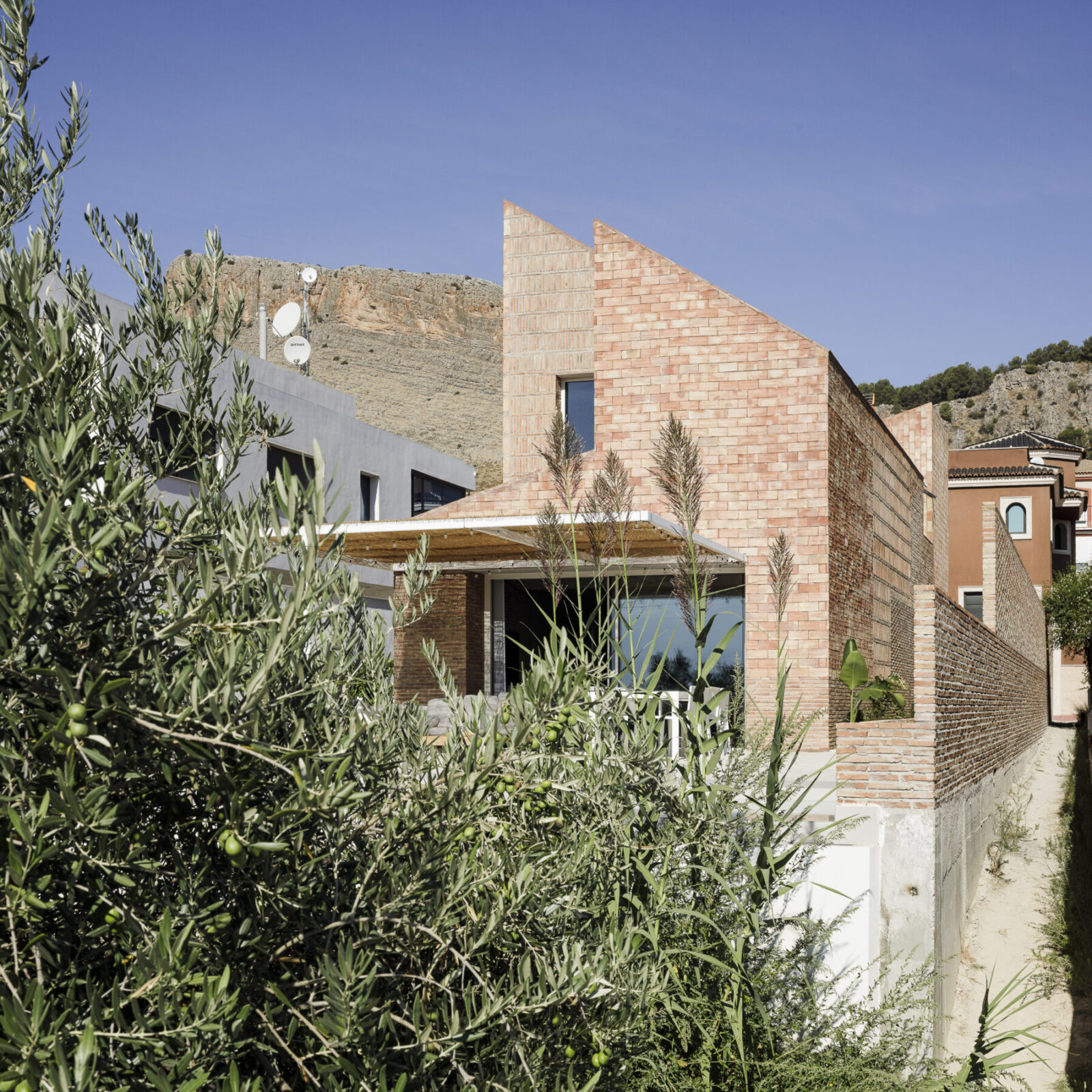 In 2017, after acquiring a plot near Albolote, at the foot of the Tajo Colorao and in front of an olive grove, they commissioned us to build a house with the wish that we would try to link that agricultural image of the Vega that resided in their memory, with their needs. The plot has narrow proportions, a situation aggravated by the existence of an easement for use of the person that takes care of the irrigation ditches on one of the long sides. This route is necessary to carry out the daily maintenance of the ditch that adjoins one of the short sides.