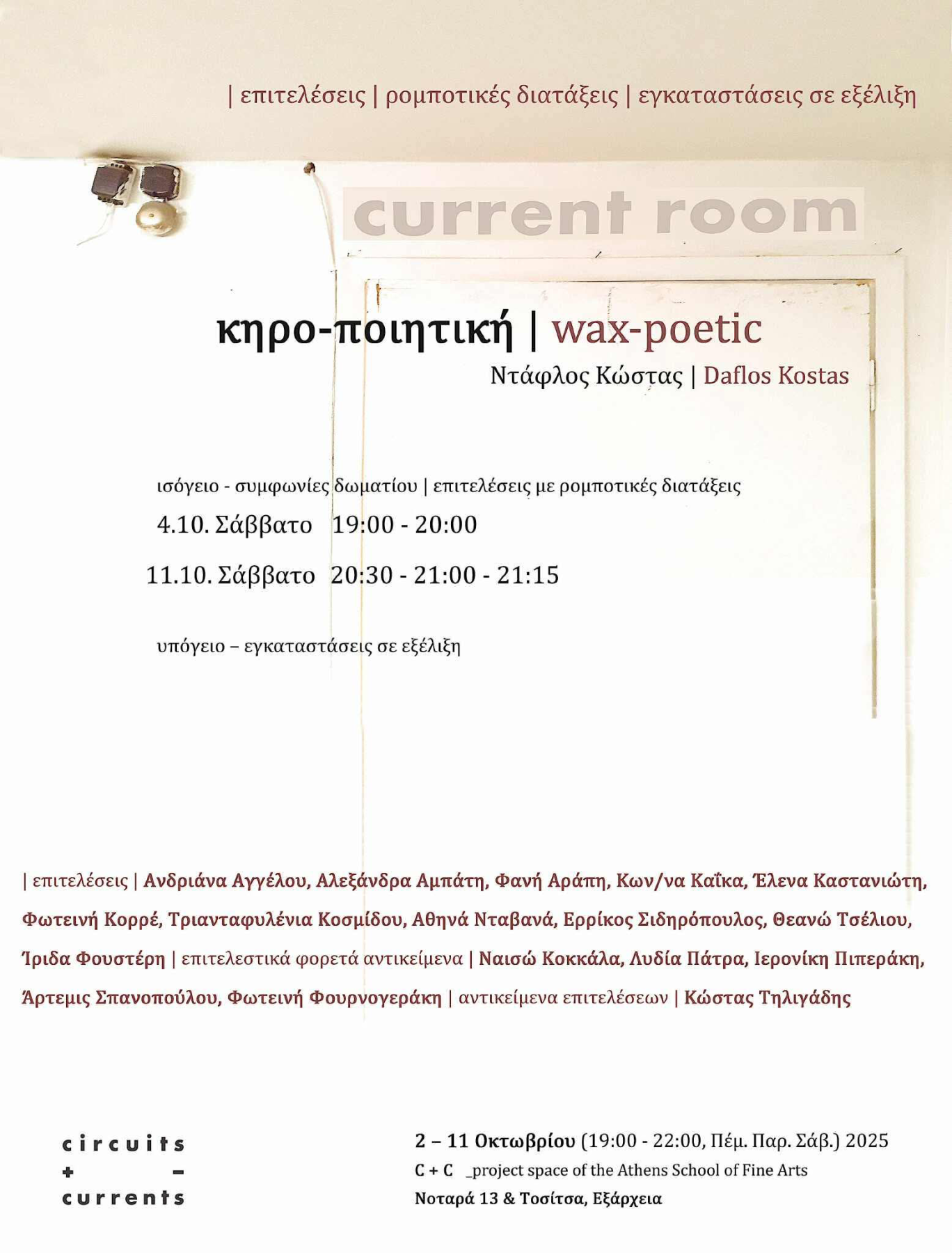 Το Circuits + Currents είναι ο χώρος εκθέσεων της Σχολής Καλών Τεχνών Αθηνών, ο οποίος λειτουργεί από φοιτητές της Α.Σ.Κ.Τ. Φιλοξενεί εκθέσεις, ομιλίες και εργαστήρια. 2 – 11 Οκτωβρίου φιλοξενούνται επιτελέσεις – ρομποτικές διατάξεις και εγκαταστάσεις σε εξέλιξη | Κηρο-ποιητική |Wax – poetic (Ντάφλος Κώστας)