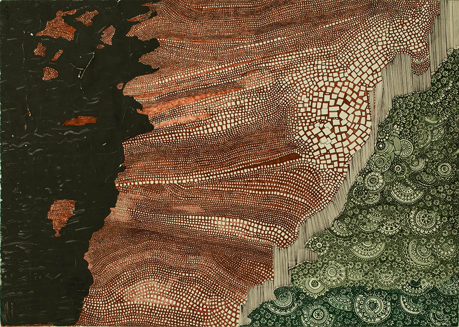 The materials used are mainly ink, markers, aquarelle and in some cases oil pastels on cotton paper. I have especially refrained from using geometrical instruments, to represent the concepts mentioned earlier. In other words, I try to use the “errors” that come naturally in a way that gives a uniqueness to the work in question.