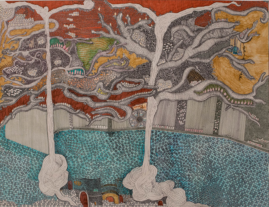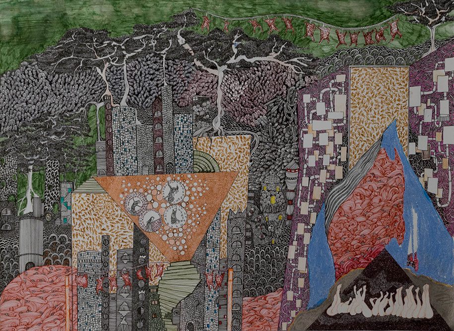 This piece was created in the midst of the migrant crisis in Greece. People were drowning in their efforts to cross the border into Greece so I decided to create this parody of a city, in which so many people are in the bottom of the sea that fish started living in the sky.