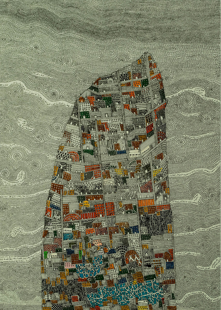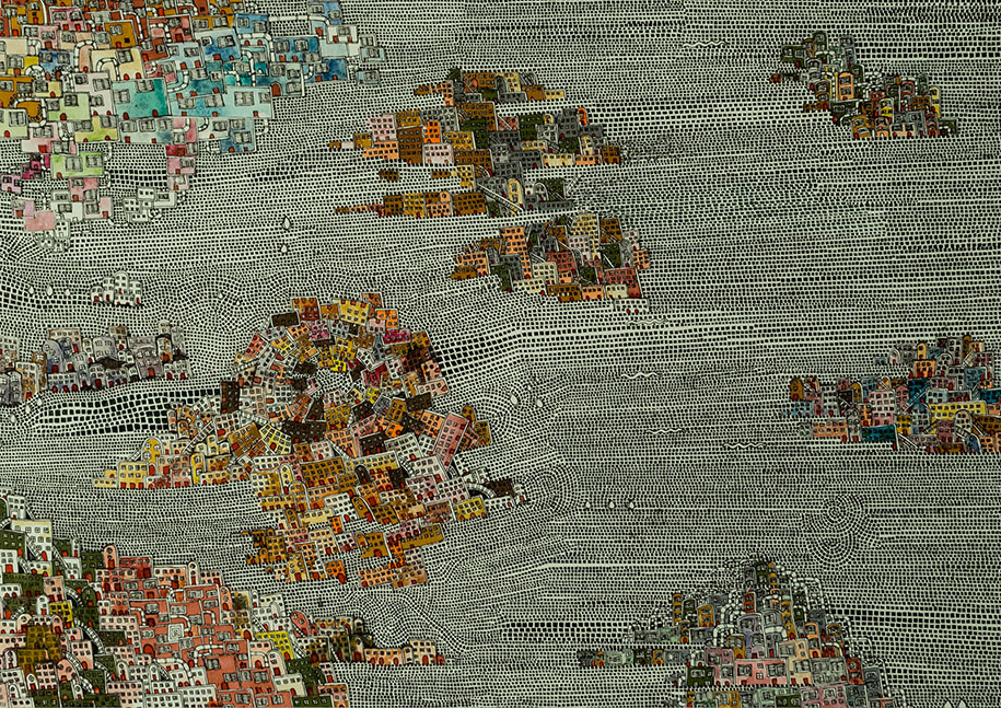 Architecture has always fascinated me, and has played a significant role in the character of my works, especially in these recent years. Cities have been leveled, as people have been forced to migrate to new cities where crowded places, elitism, and isolation, are in store for them. My recent work has been a political comment on this situation, where I draw colorful, unique cities, totally void of the human element. People, drawn as numbers in some cases or as white squares – in contrast to the exuberance of the cities – are placed everywhere around the cities, but never inside them.