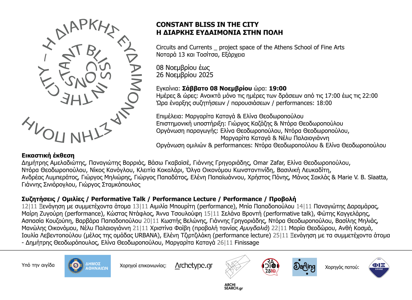 Η ομαδική έκθεση ‘Η ΔΙΑΡΚΗΣ ΕΥΔΑΙΜΟΝΙΑ ΣΤΗΝ ΠΟΛΗ – CONSTANT BLISS IN THE CITY’, σε επιμέλεια των Ελίνα Θεοδωρόπουλου & Μαργαρίτα Καταγά, που θα πραγματοποιηθεί στον χώρο της Ανώτατης Σχολής Καλών Τεχνών στο κέντρο της πόλης, Circuits and Currents από 8-26 Νοεμβρίου εξετάζει την έννοια της ευδαιμονίας με την ευρεία πολιτική της διάσταση.
