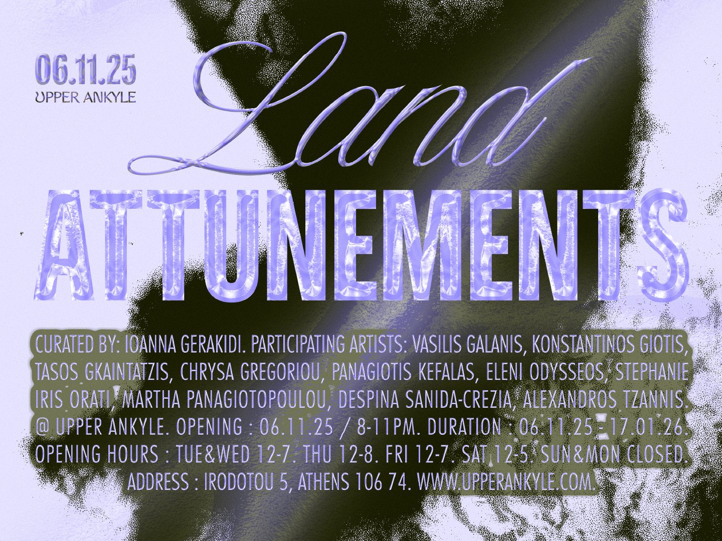 Το Upper Ankyle, ο νέος artist-run χώρος της Αθήνας, παρουσιάζει από 6 Νοεμβρίου 2025 έως 17 Ιανουαρίου 2026 την ομαδική έκθεση Land Attunements, με τη συμμετοχή των καλλιτεχνών Βασίλη Γαλάνη, Κωνσταντίνου Γιώτη, Τάσου Γκαϊντατζή, Χρύσας Γρηγορίου, Παναγιώτη Κεφαλά, Ελένης Οδυσσέως, Stephanie Iris Orati, Μάρθα Παναγιωτοπούλου, Δέσποινας Σανιδά-Κρεζία, Αλέξανδρου Τζάννη, σε επιμέλεια της Ιωάννας Γερακίδη.