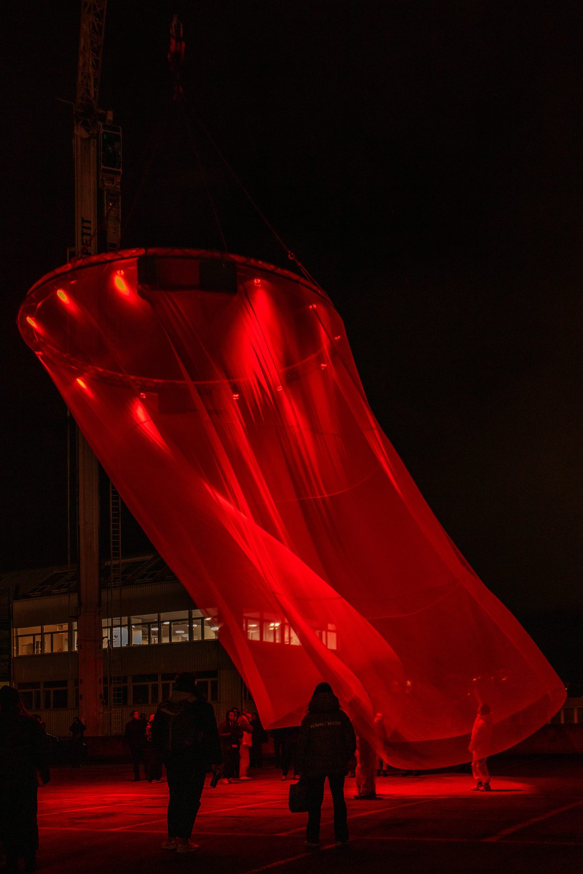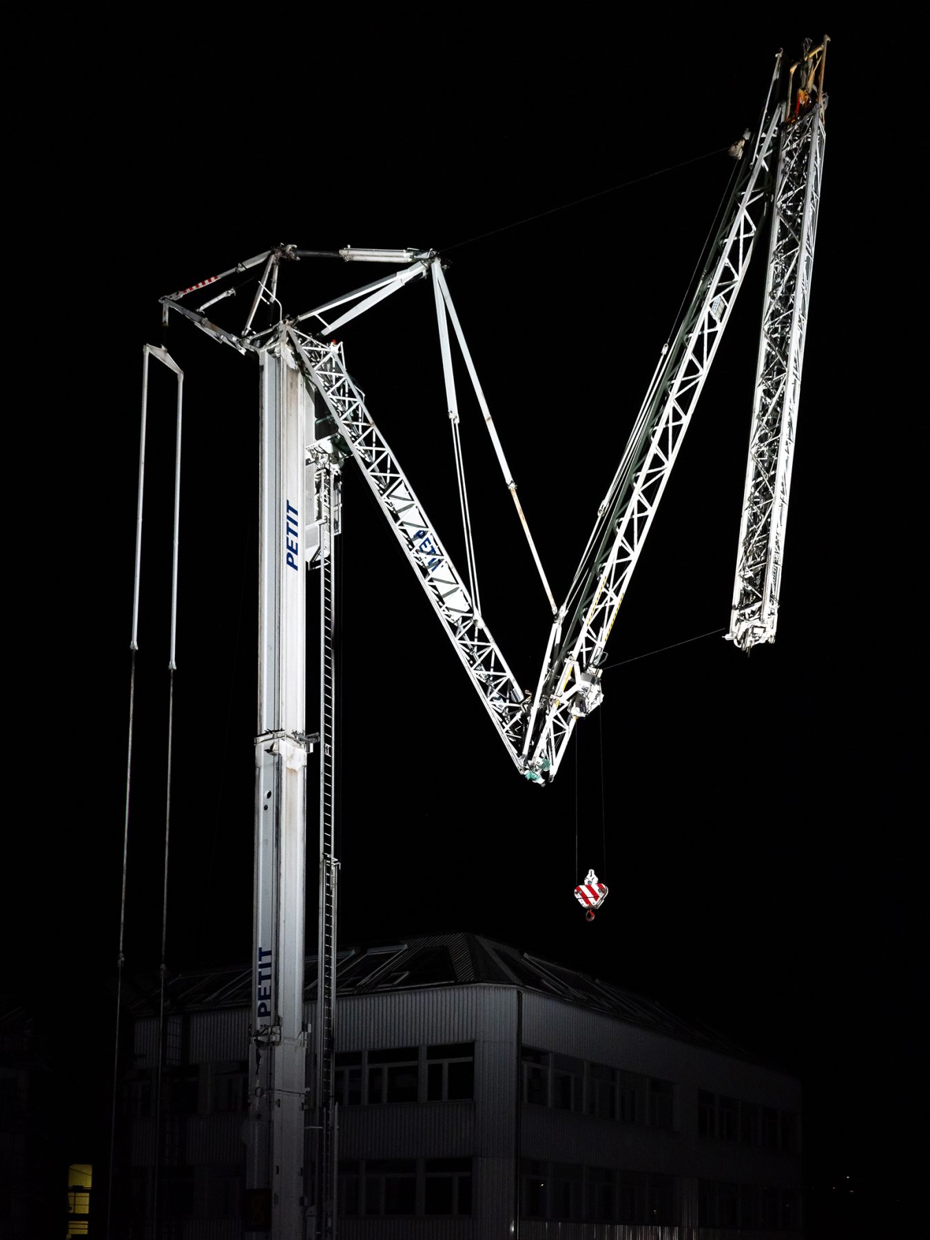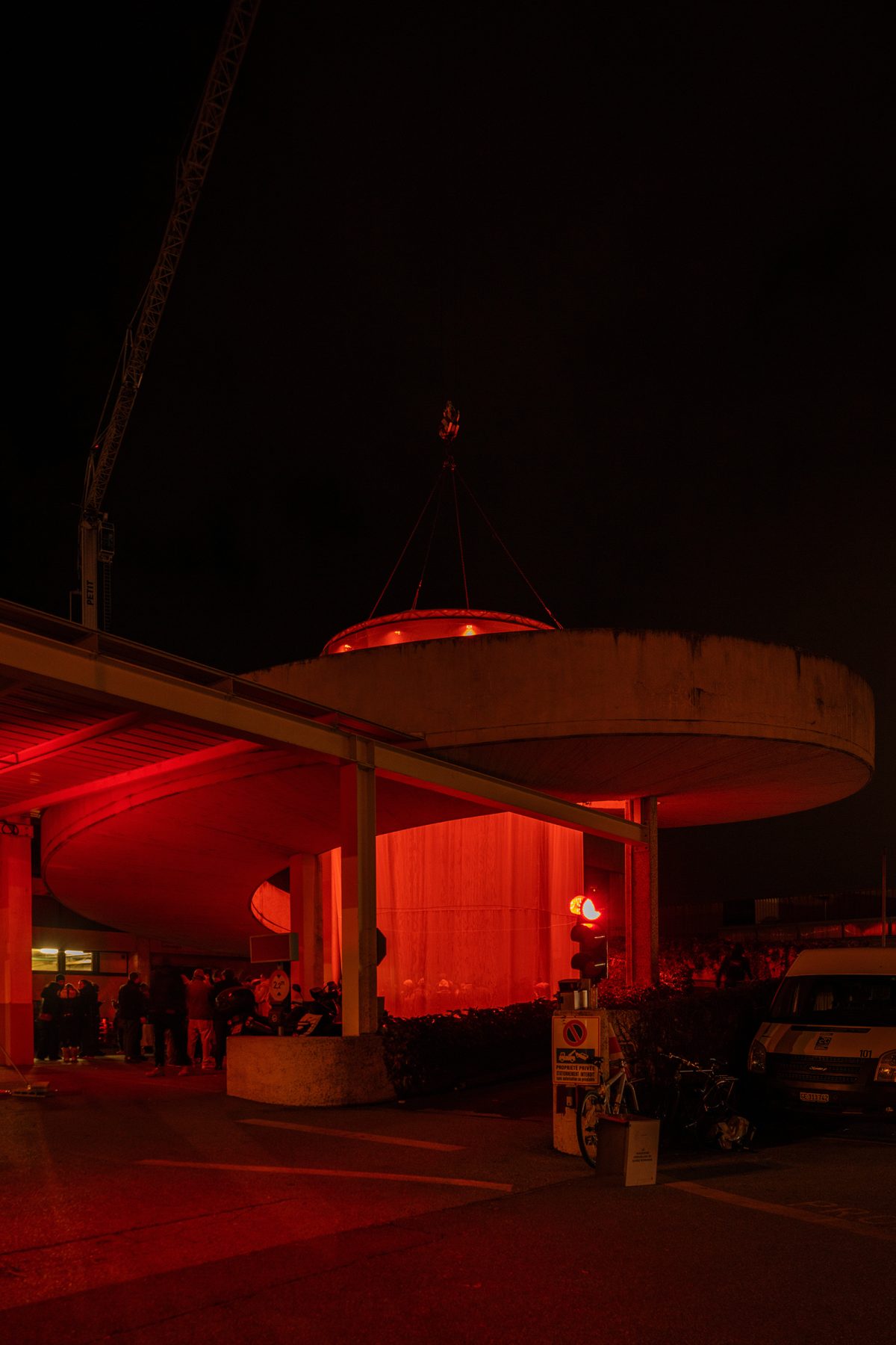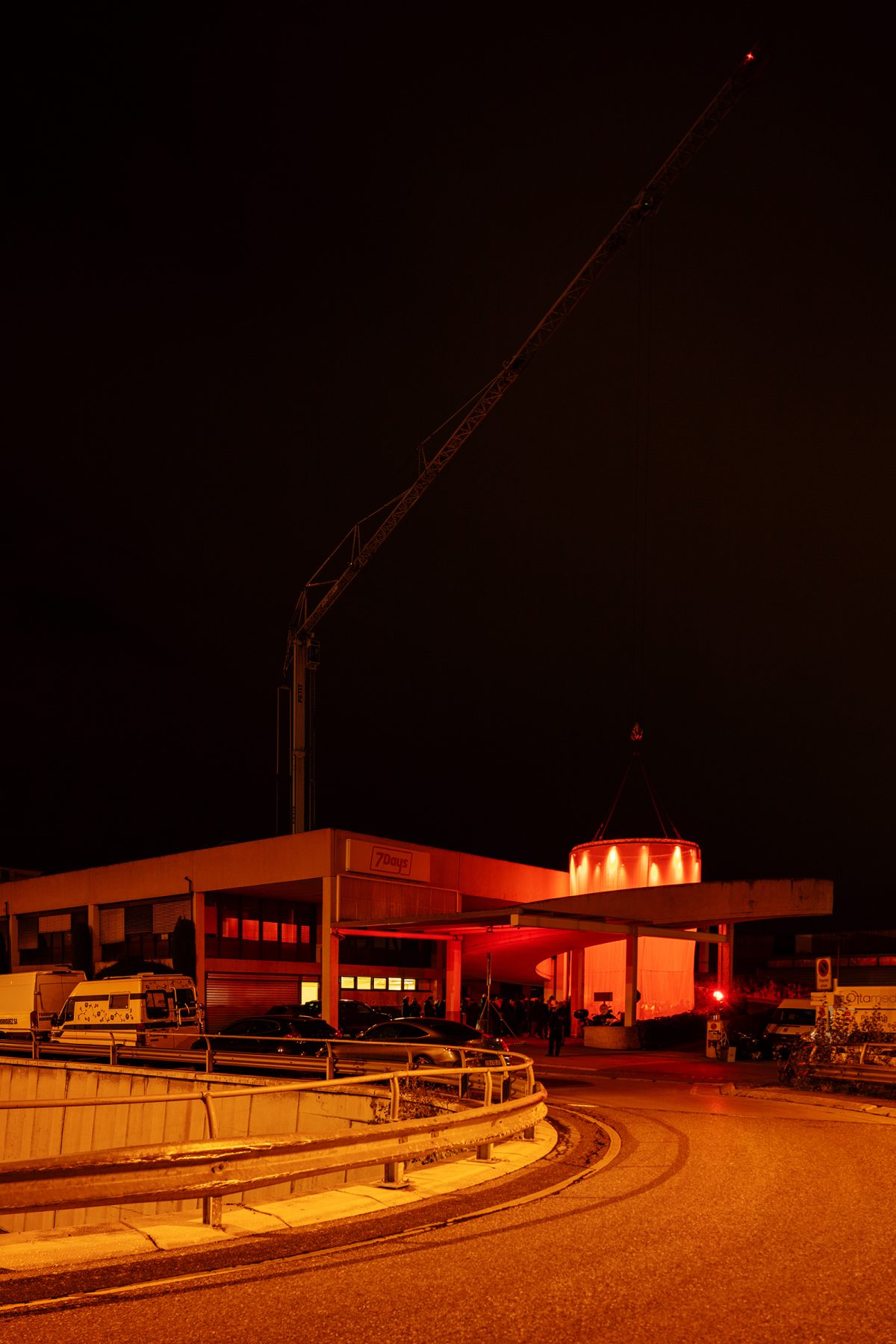 A luminous crane unfolds slowly, once a symbol of urban transformation, it is here diverted from its original purpose. Its slow, deliberate movement lifts a veil, a catalyst for metamorphosis, which glides gracefully through the raw space of a parking lot, subtly transforming the atmosphere and the interactions that unfold along its path.