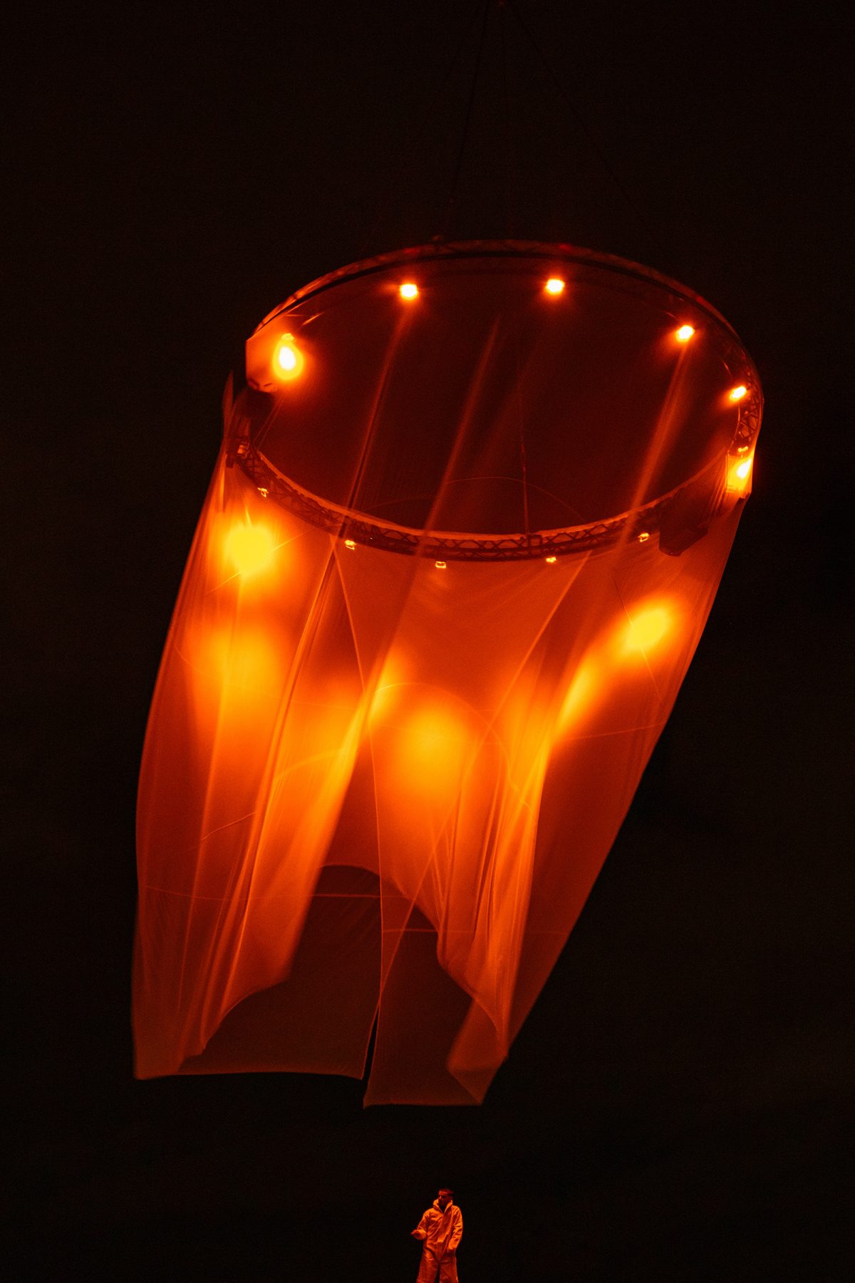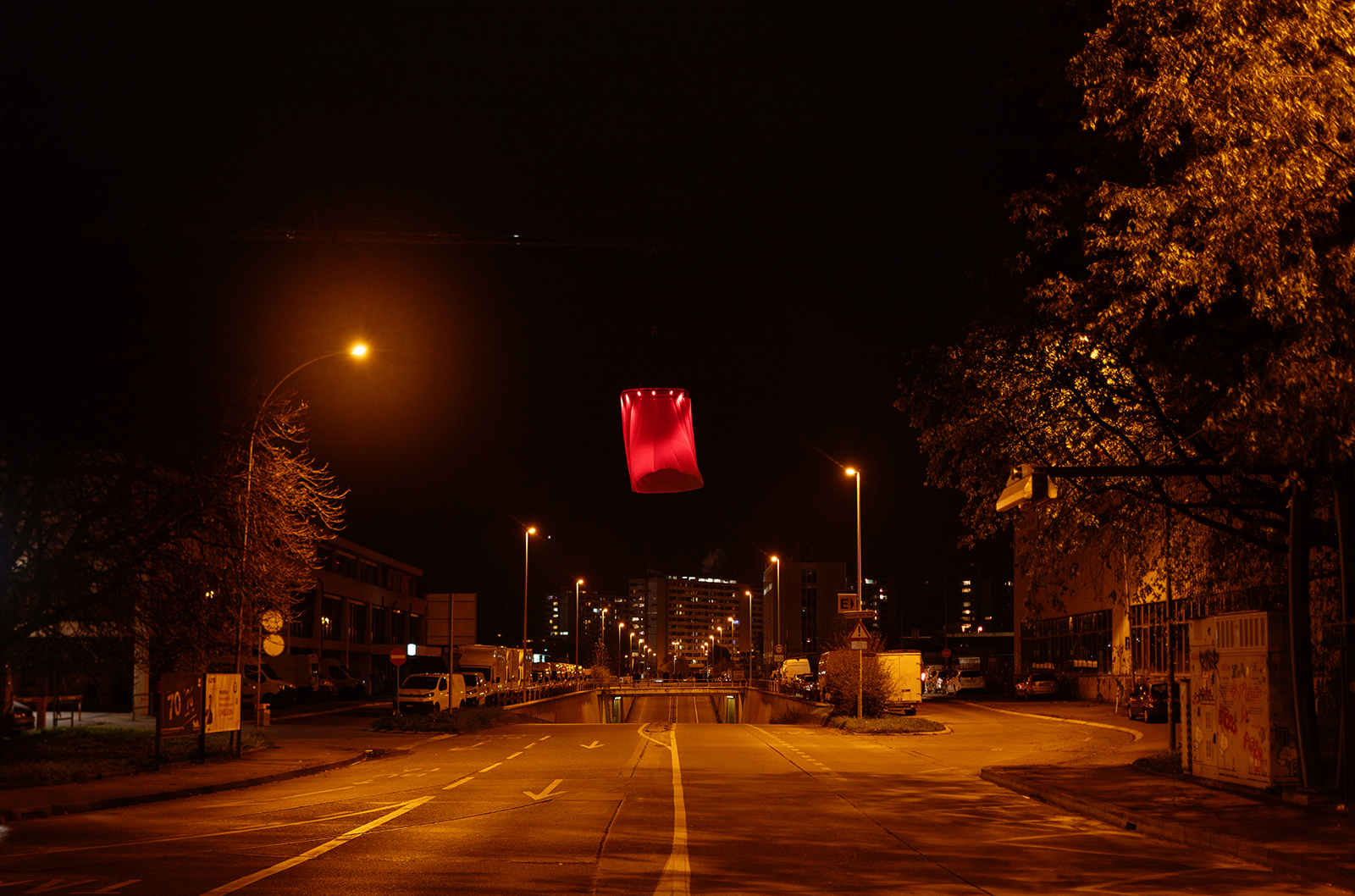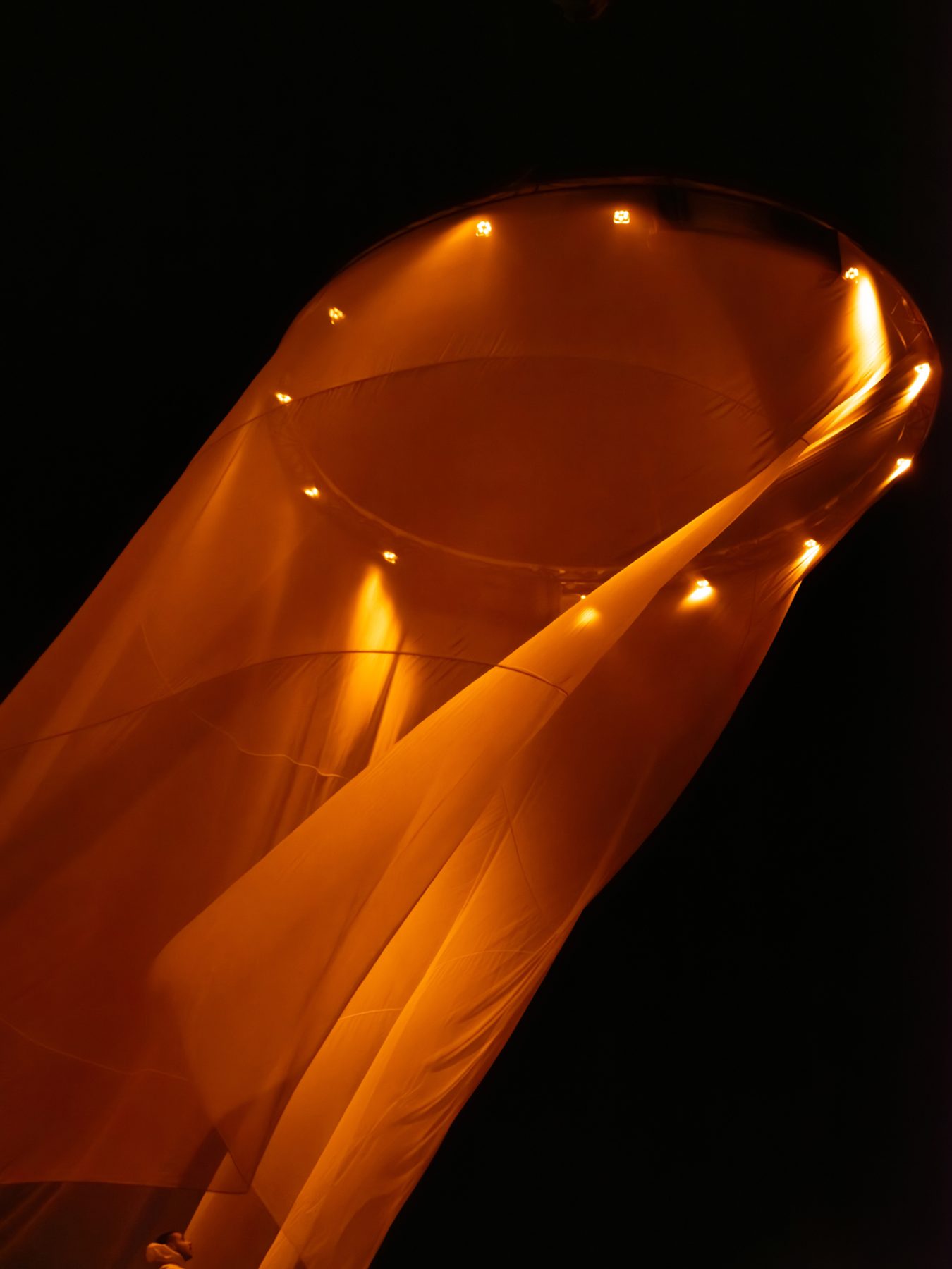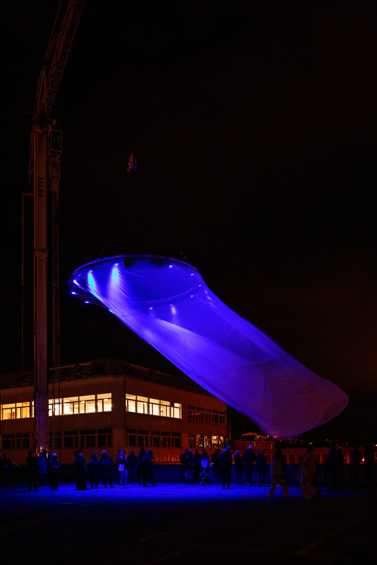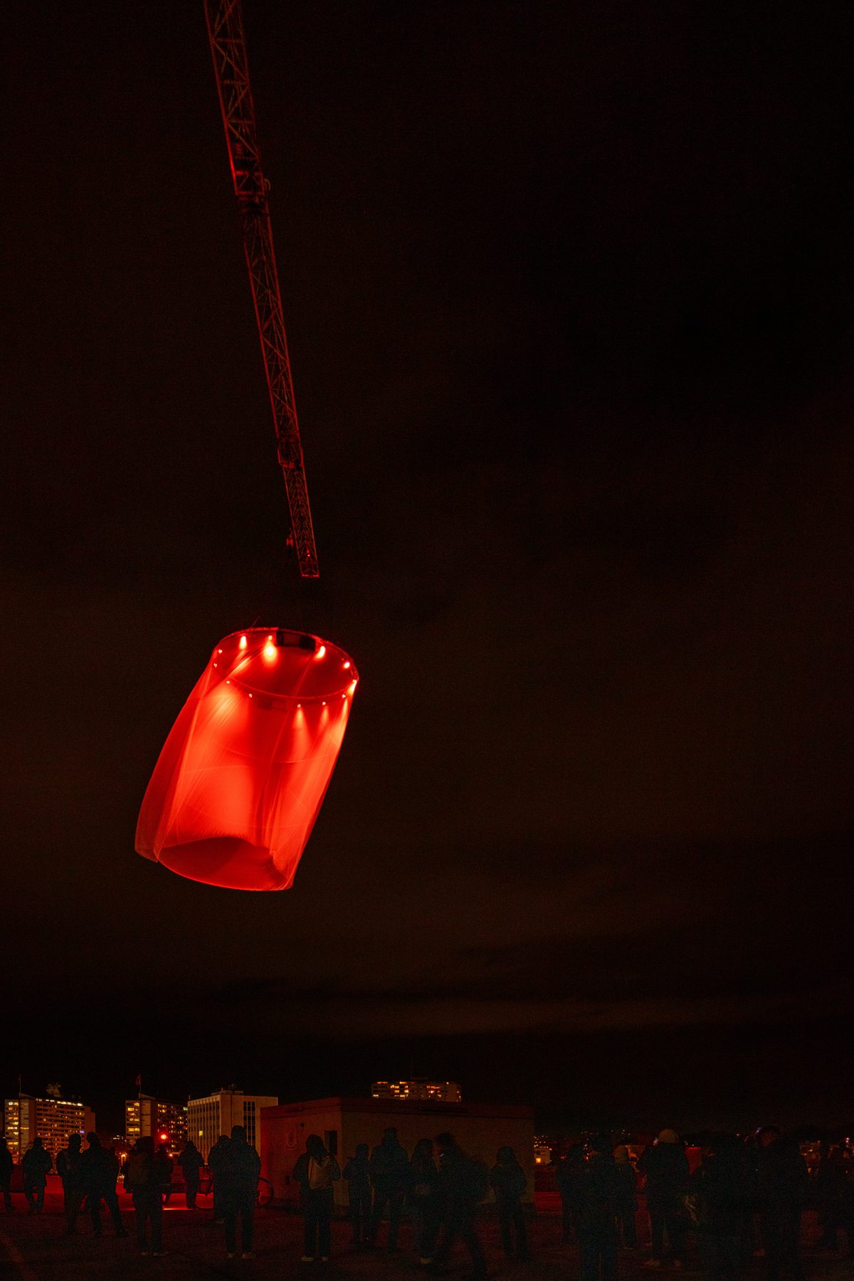 A luminous crane unfolds slowly, once a symbol of urban transformation, it is here diverted from its original purpose. Its slow, deliberate movement lifts a veil, a catalyst for metamorphosis, which glides gracefully through the raw space of a parking lot, subtly transforming the atmosphere and the interactions that unfold along its path.