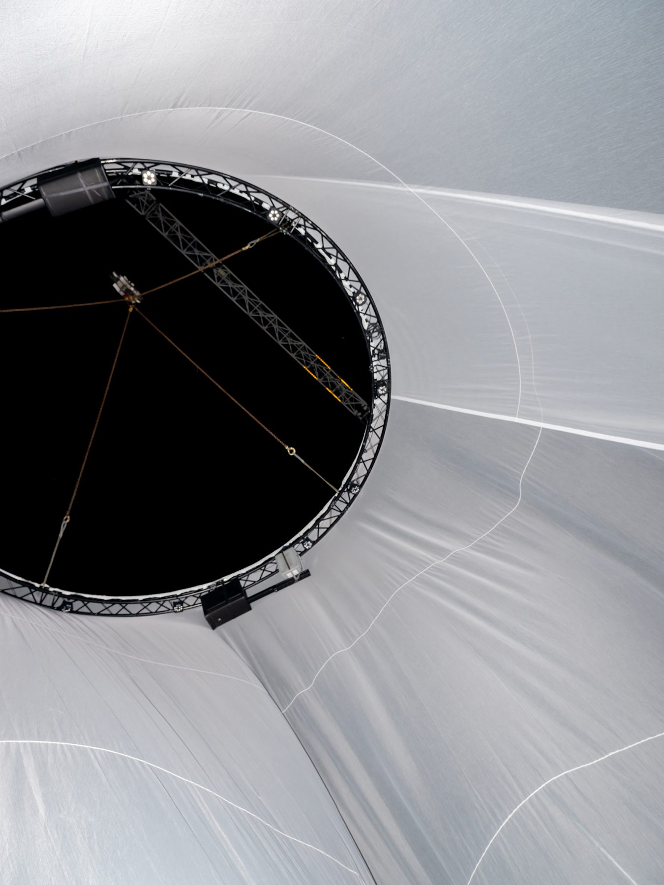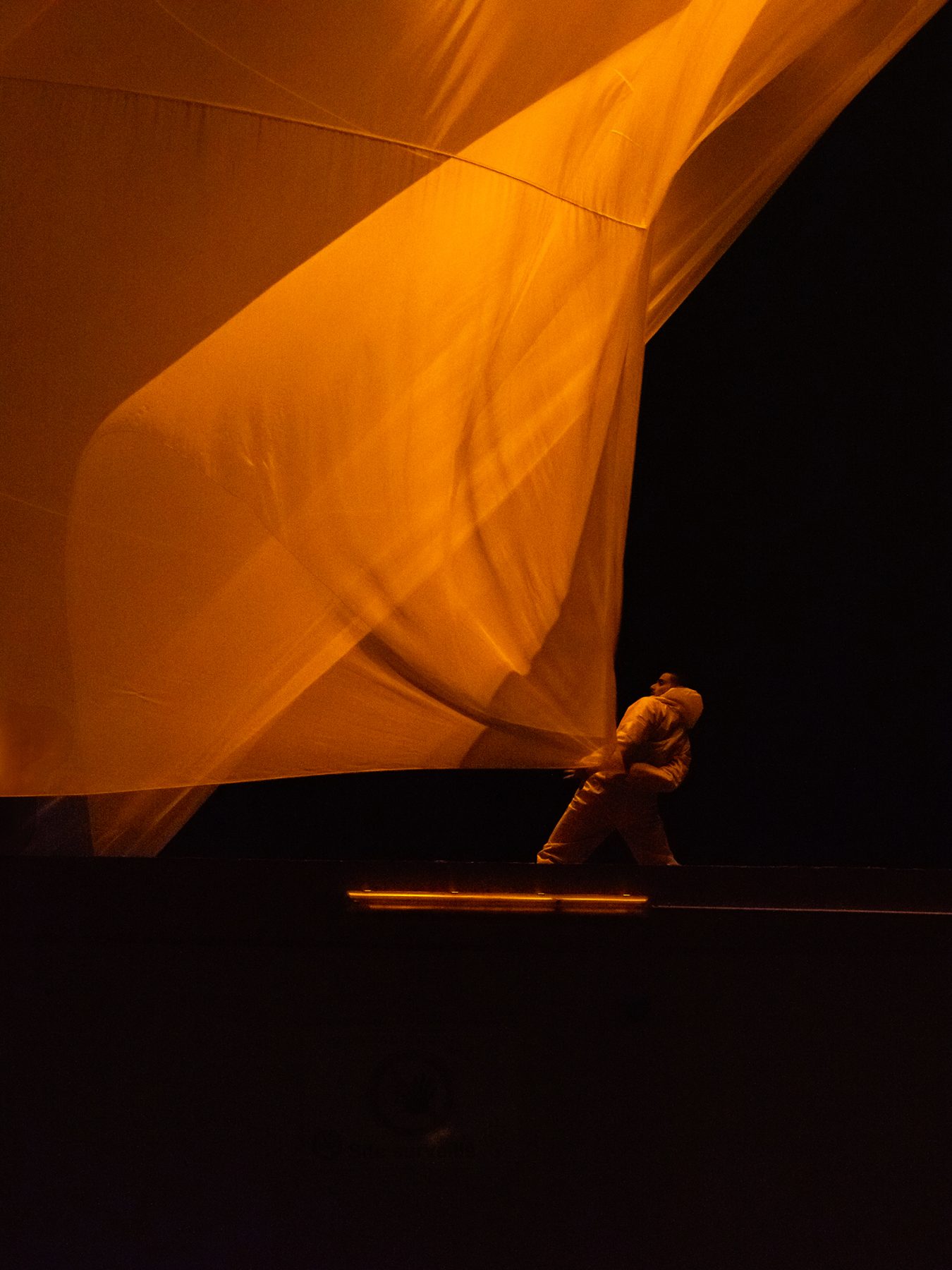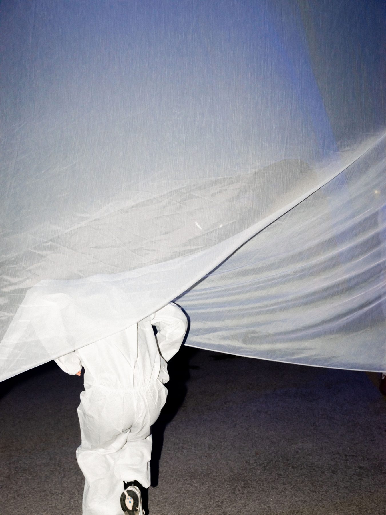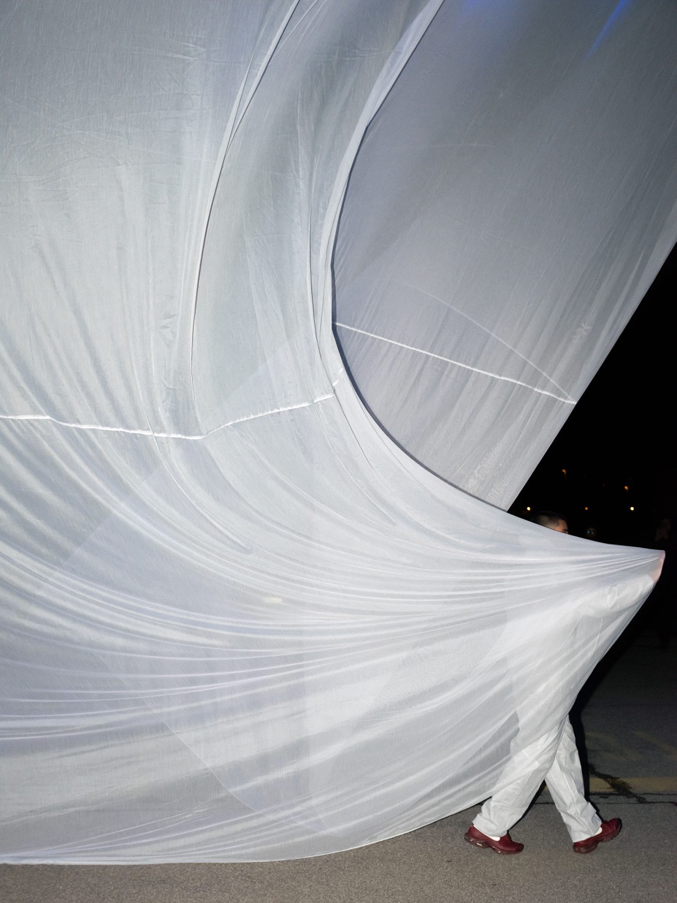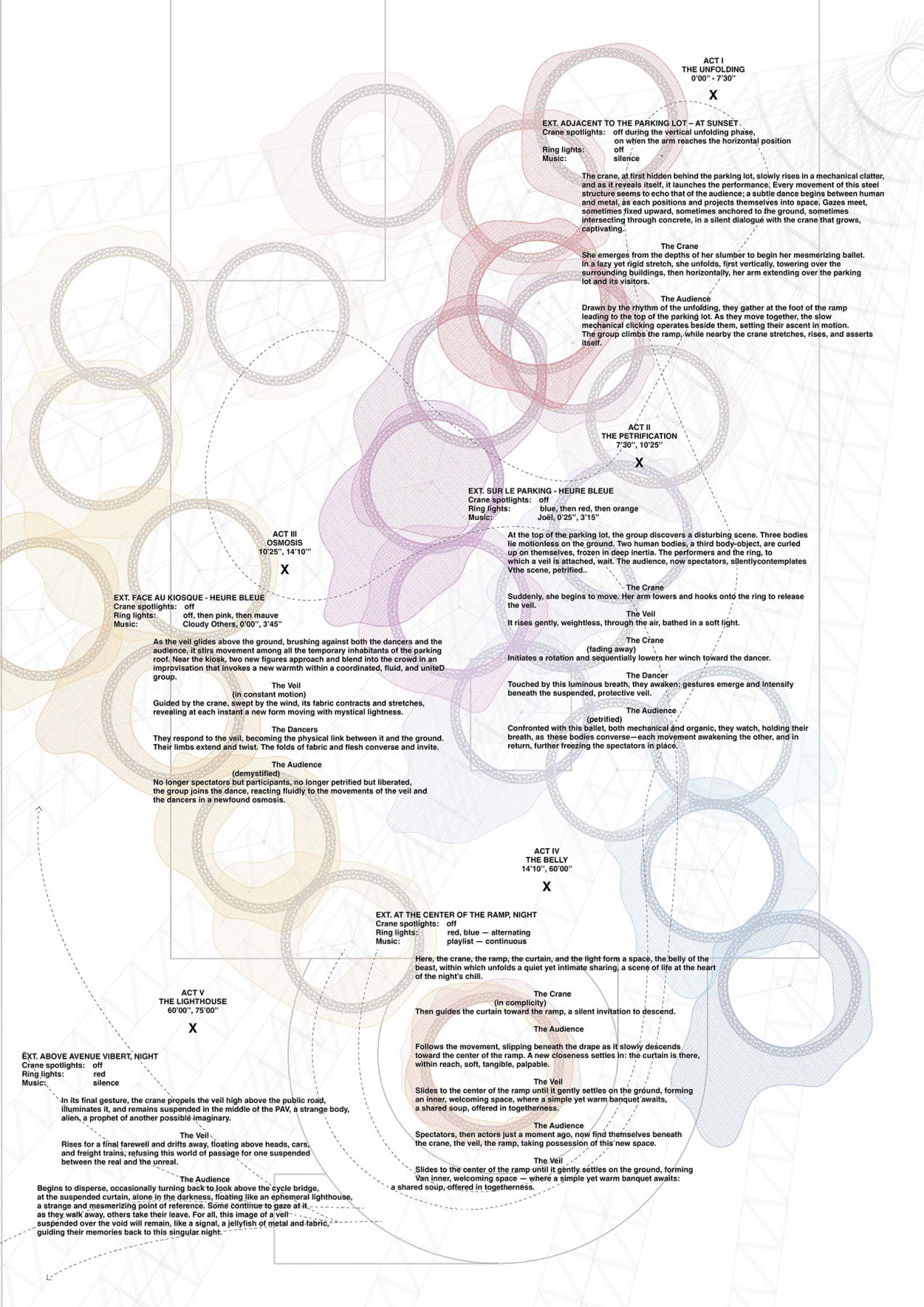 Conceived as a play in several acts, the project orchestrates a precise dialogue between a crane, a veil, and a group of dancers.