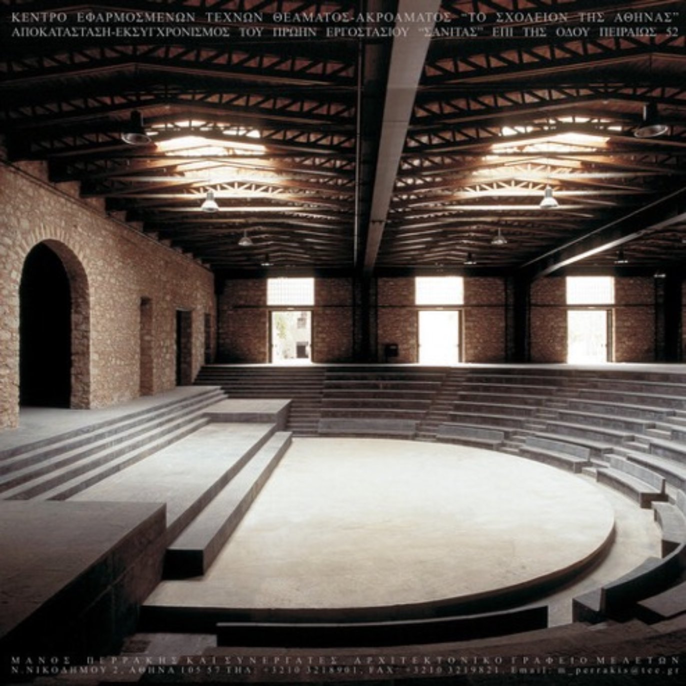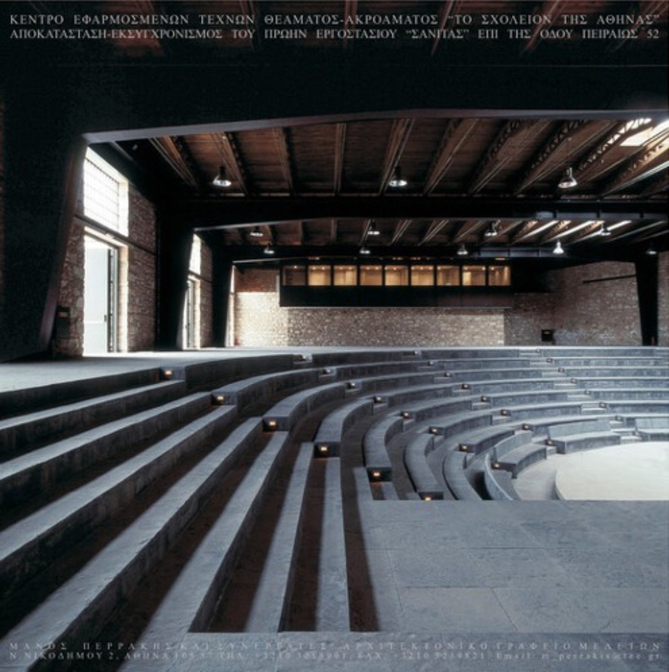 Για το «Σχολείον» της Ειρήνης Παππά επί της λεωφόρου Πειραιώς στο Μοσχάτο, ο Περράκης δούλεψε σε επιφάνεια 7,5 στρεμμάτων εντός κτιριακού συγκροτήματος 5.000 τετραγωνικών μέτρων που είχε κατασκευαστεί ως νοσοκομείο, στις πρώτες δεκαετίες του νεοσύστατου ελληνικού κράτους, στη συνέχεια εγκαταλείφθηκε και αργότερα λειτούργησε ως βιομηχανικός χώρος στεγάζοντας από εργοστάσιο κινίνου έως εργοστάσιο της Σάνιτας. Κι εδώ, στην μεγάλη κλίμακα, ο Περράκης λειτούργησε με οδηγό το όραμα του ανθρώπου που είχε απέναντί του και τον εμπιστεύθηκε δημιουργώντας ένα εντυπωσιακό αμφιθέατρο 500 θέσεων, σκαμμένο ολοκληρωτικά μέσα στο δάπεδο του κτιρίου, με επένδυση μαύρης πέτρα που διάλεξε η Ειρήνη Παππά από τη Ρόδο.