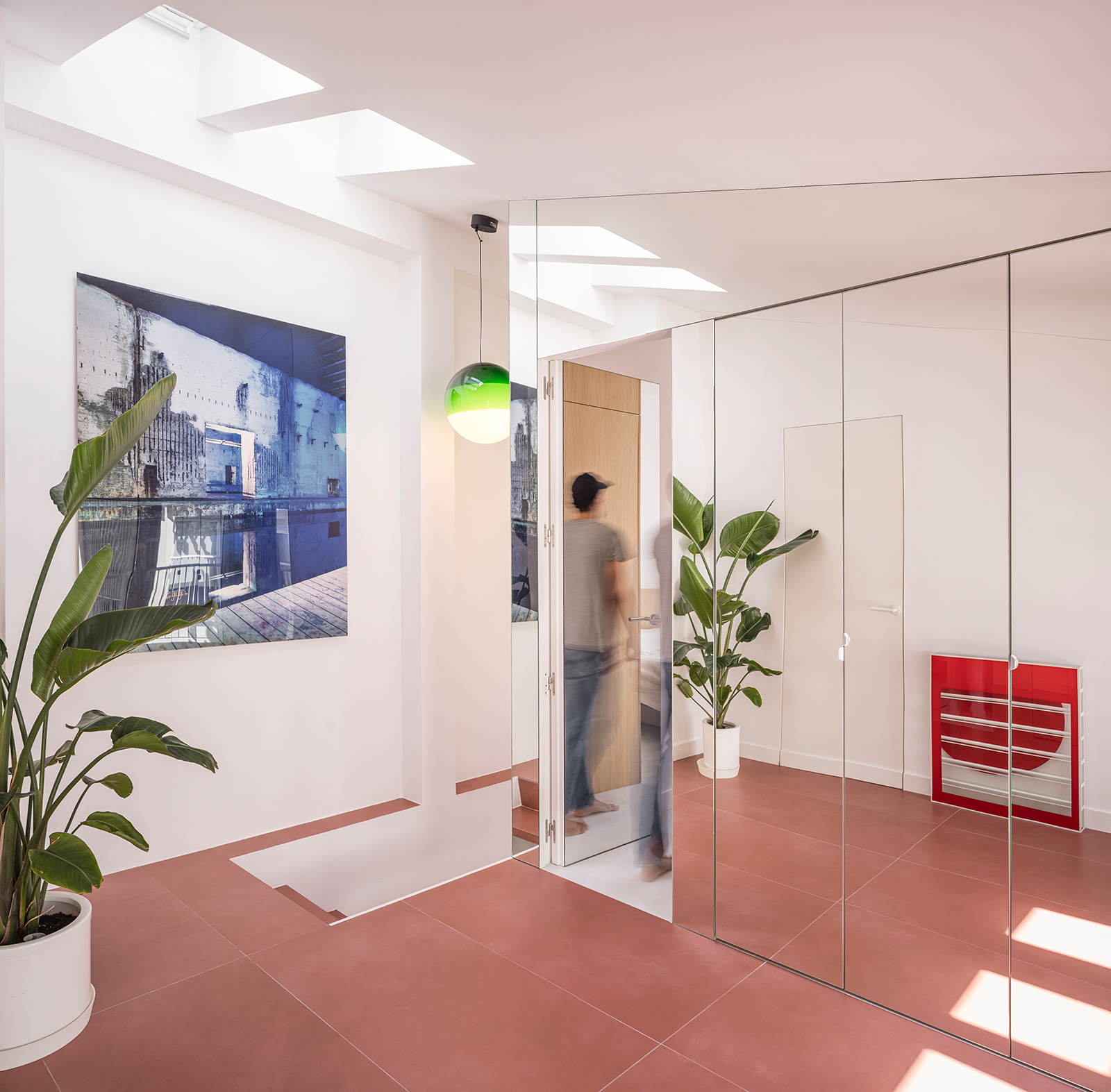 Material choices reinforce this continuity. Ceramic tiles inspired by traditional French tomettes unify interior spaces while extending visually toward the terrace, dissolving boundaries between inside and out. Mirrored surfaces in bathrooms and bedrooms multiply perspectives, dematerializing volumes and amplifying light. Books, artworks, lamps, and objects find their place within a house conceived as a continuous exterior space—fluid, layered, and deeply personal.