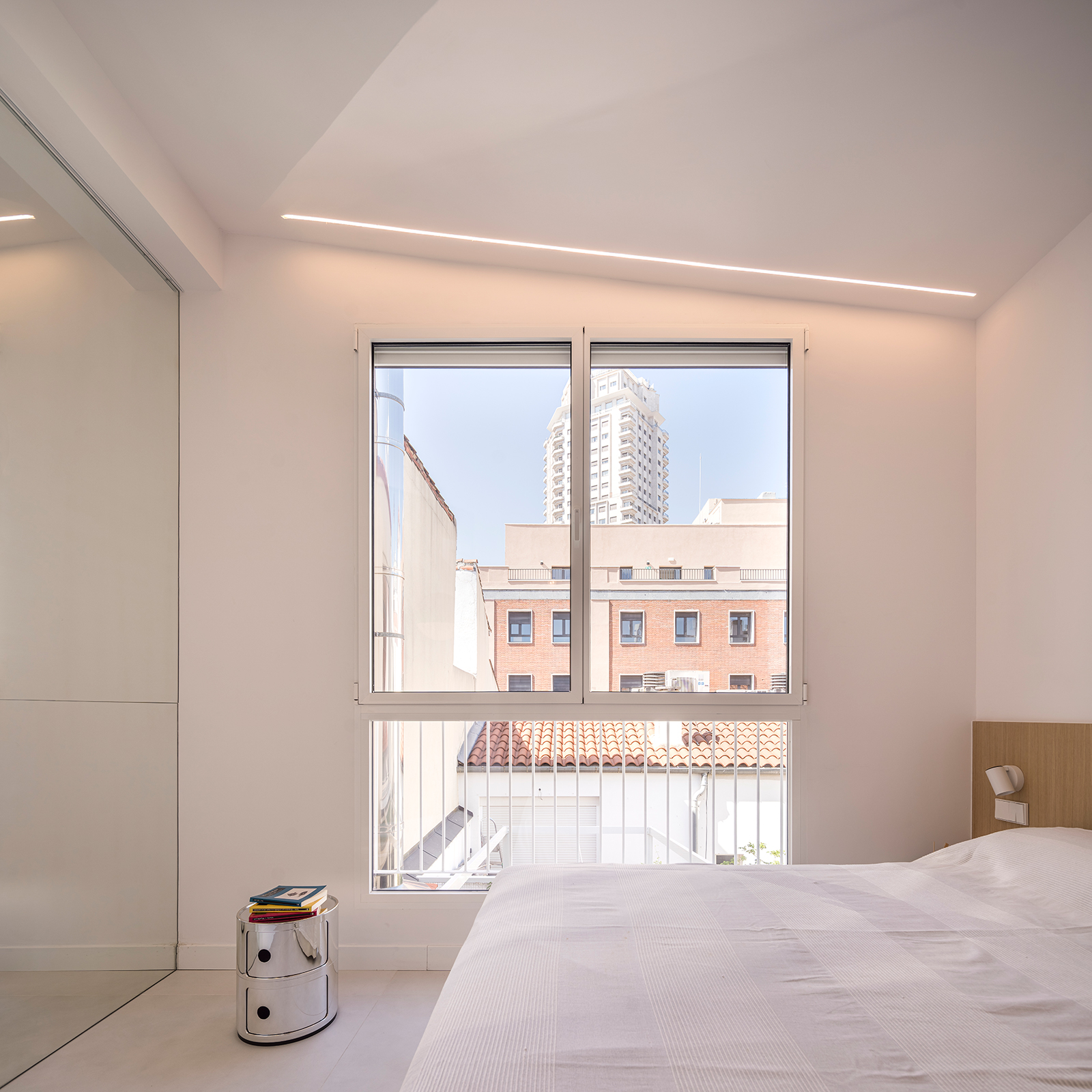A ROOM MEASURED BY STILLNESS. THE CITY FRAMED, THE BED ANCHORED, THE BODY MOMENTARILY AT REST.