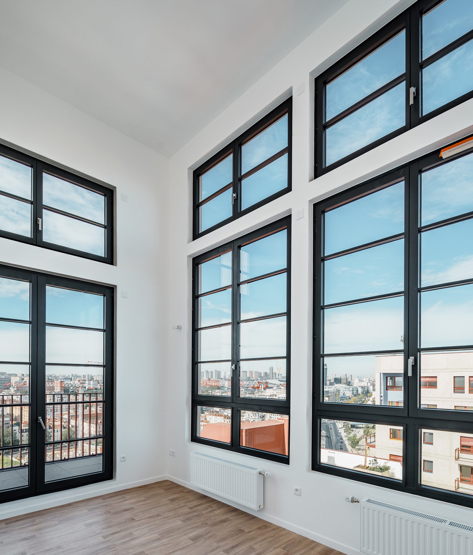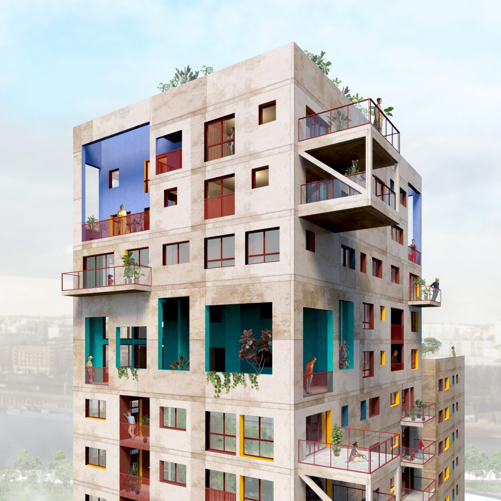 At START, the architecture emerges from the internal life of its dwellings, with geometry, window rhythms, and color accents shaped by use rather than imposed from outside. Exceptionally slender buildings—just 14 metres deep yet rising up to 56 metres—maximize natural light, ventilation, views, and typological variety, with 90% of homes enjoying double or triple orientations. Towers are articulated in three parts—street, city, and sky—while a turquoise shared-space band at the seventh floor introduces horizontal rhythm.