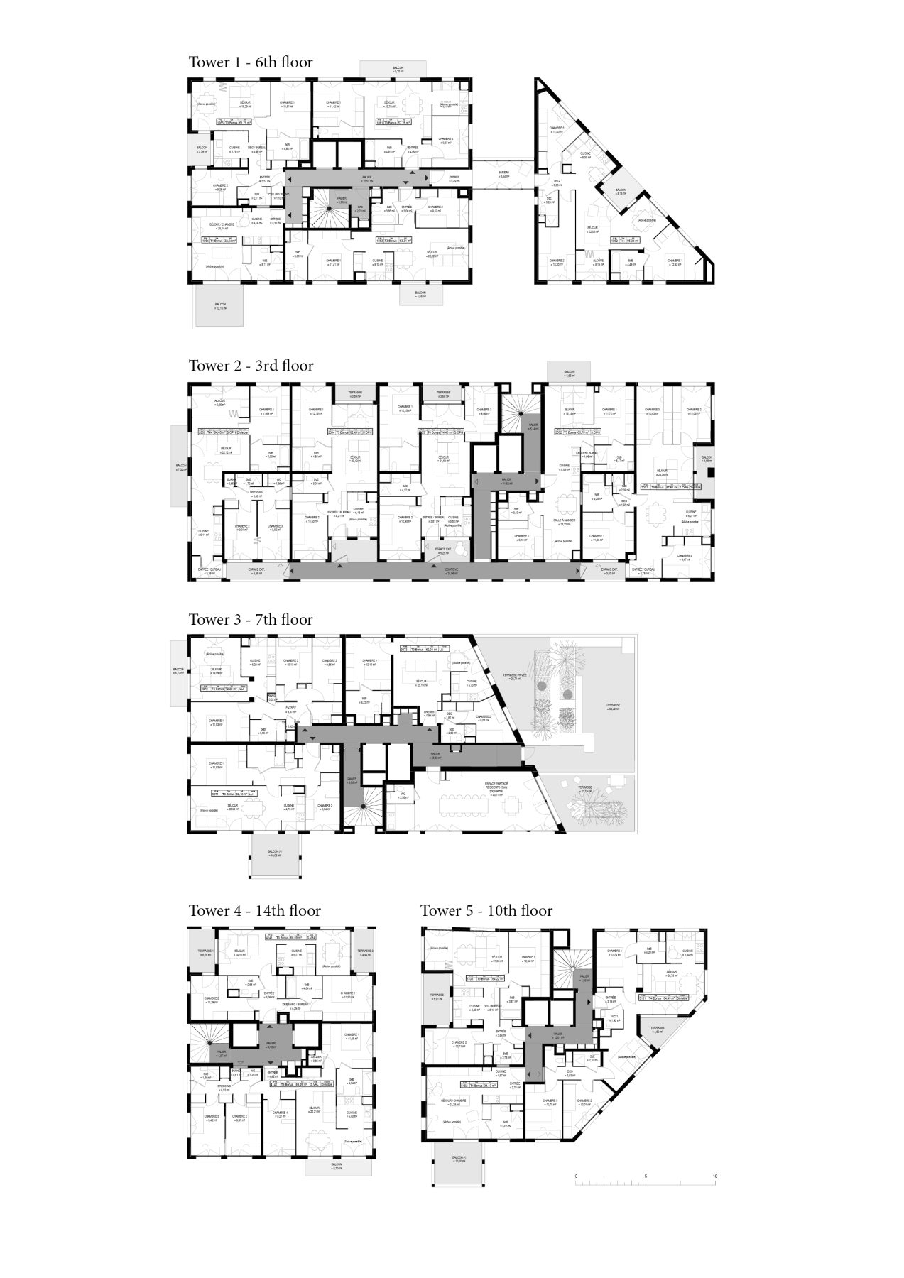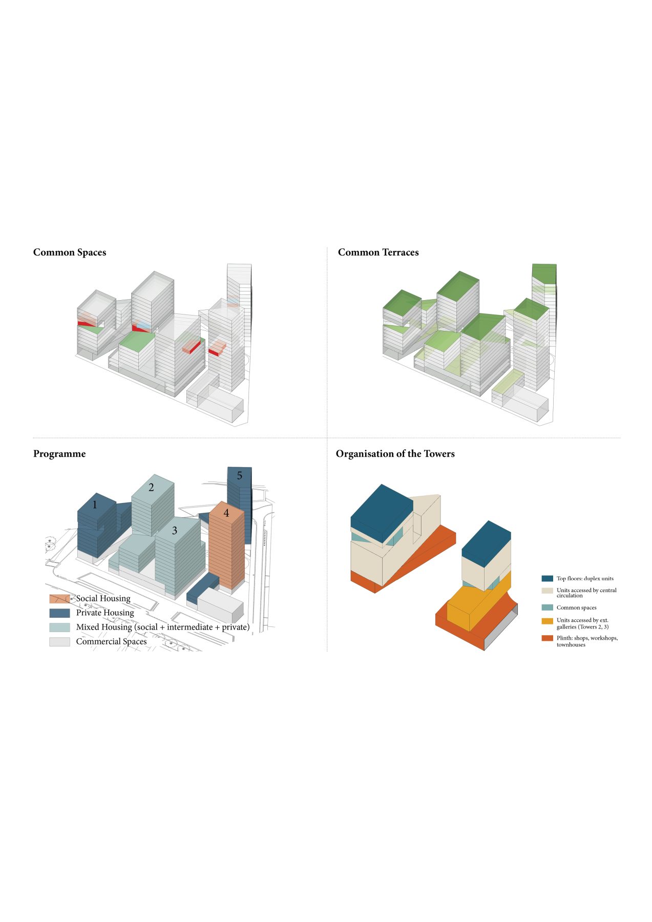 The project delivers a diverse range of housing typologies, from studios to five-bedroom units, including intermediate configurations labeled “bonus” and “plus.” Its design is guided by three complementary frameworks: the 10 Adaptability Principles, which ensure dwellings remain flexible and resilient—through divisible units, “plus” alcove rooms, modular living areas, and highly adaptable two-bedroom layouts; the 8 Quality Principles, promoting naturally lit kitchens and bathrooms, maximized storage, and efficient circulation; and the 10 Principles for a Good Tower, establishing desirable density through thoughtful circulation, shared spaces, terraces, and rich spatial relationships with both ground and sky.