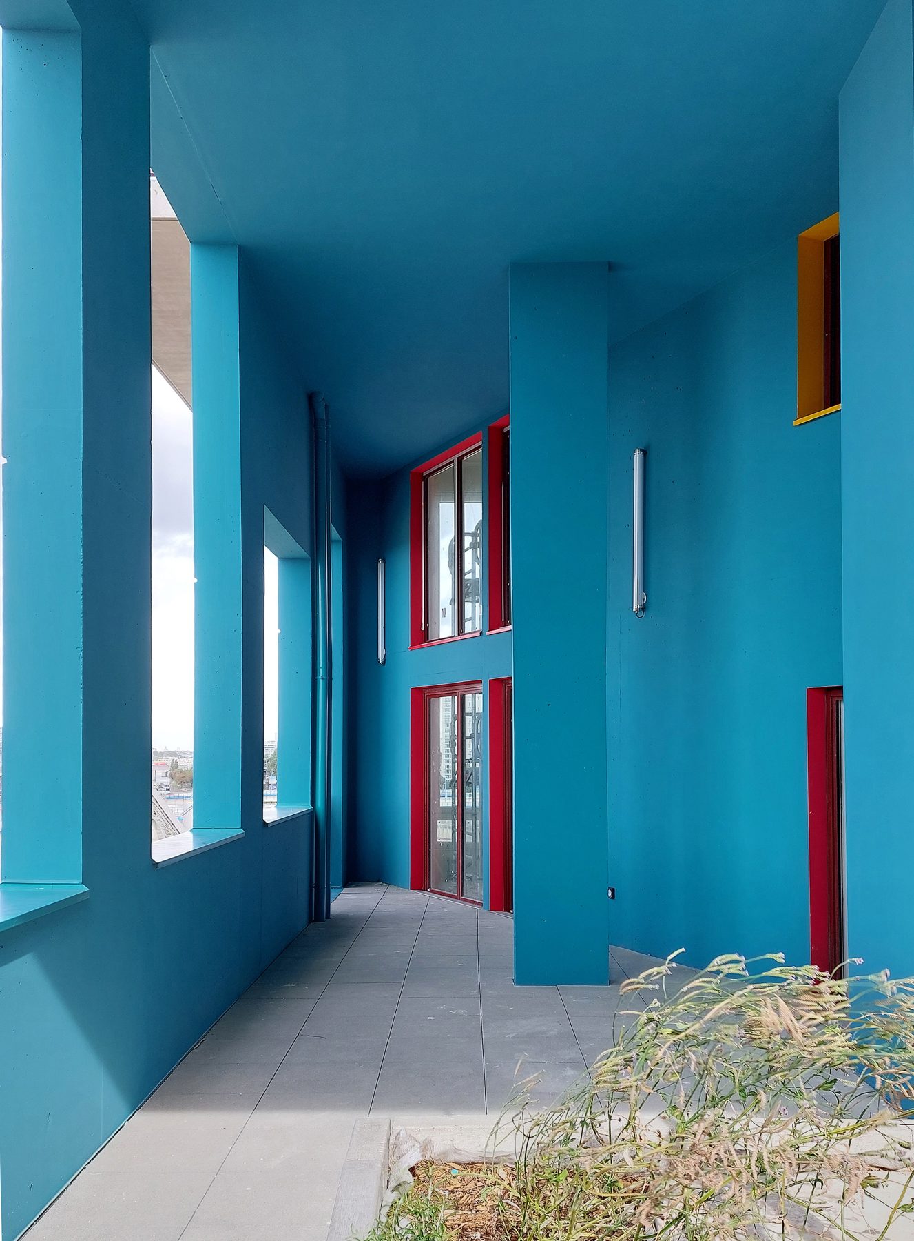 The primary façades, composed of raw concrete and red paint, pay homage to Ivry’s architectural heritage, echoing the city’s emblematic concrete and brick buildings.