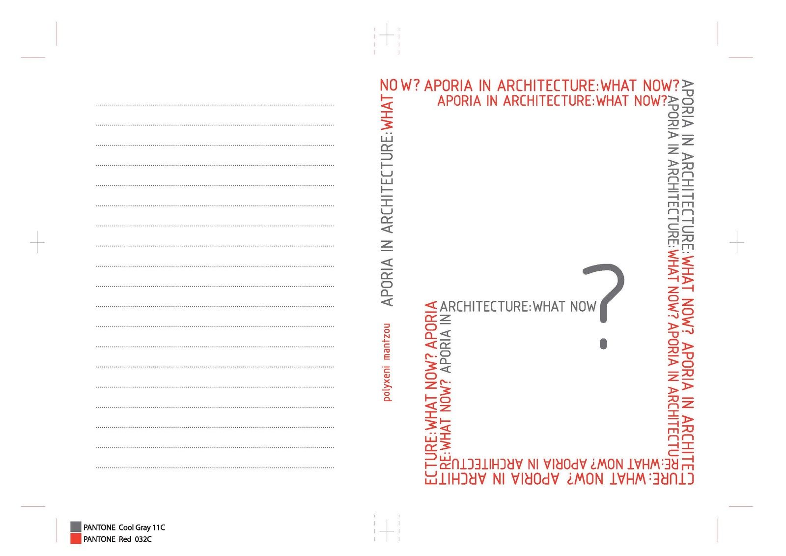 The title of this book recognizes these three states of aporia as the condition that architecture is found in and asks What Now?