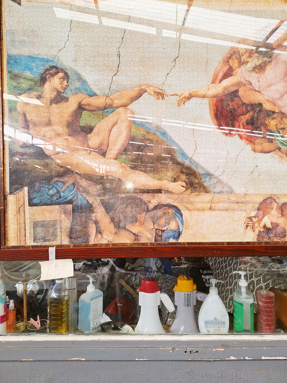 My reason for being here is to look at things: colors, words, and shapes constantly distract me, along with the warm sunlight casting shadows on every backdrop: there is little of what I see that I can predict.
