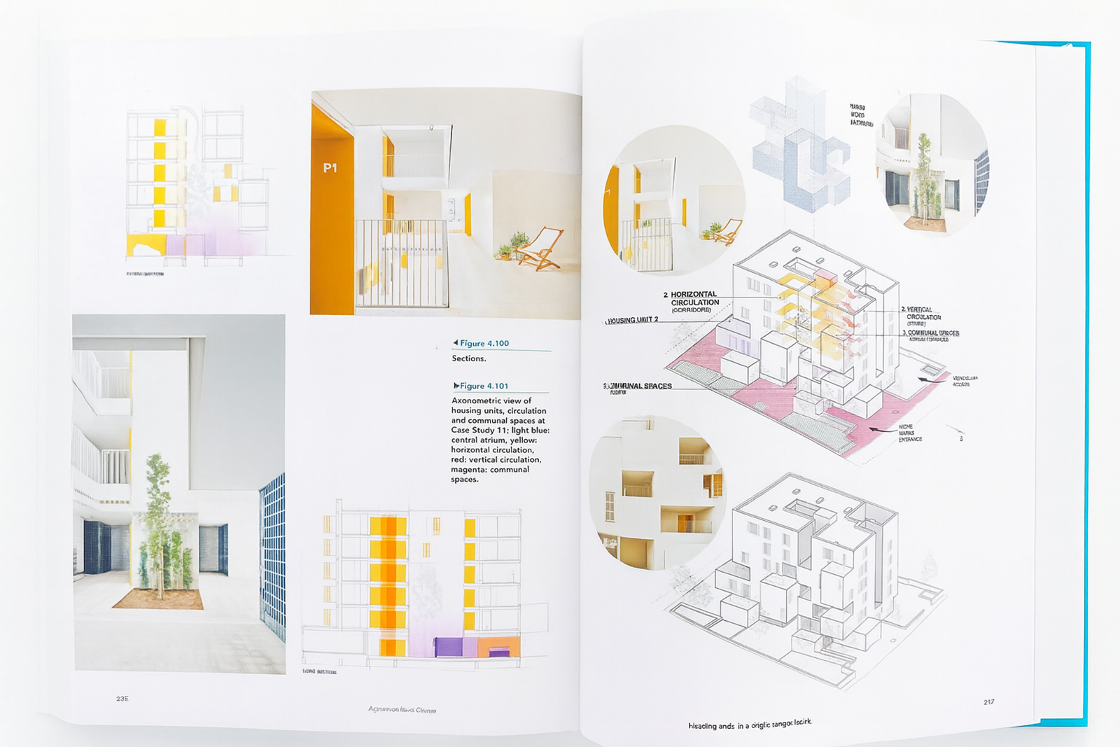 The book’s author clearly and explicitly demonstrates multiple combinations of the three elements during the massing phase of schematic design for multi-unit housing projects by examining case studies of more than fifteen globally renowned apartment buildings.
