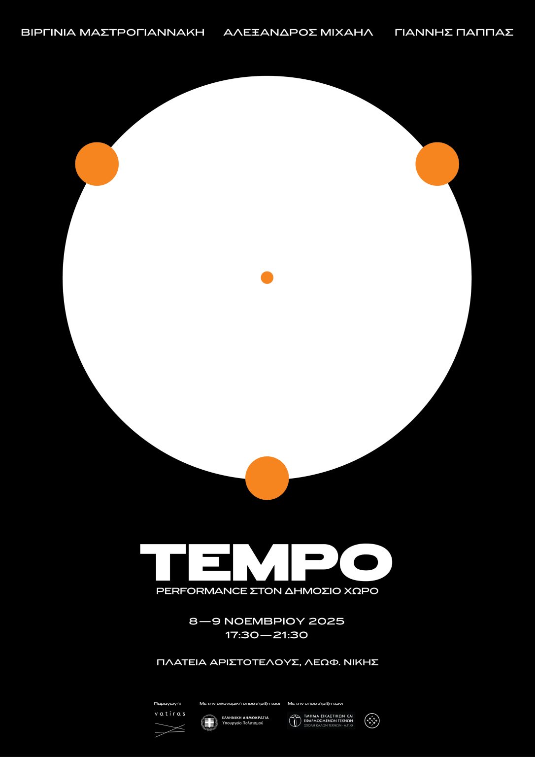 Το TEMPO, σε σύλληψη και επιτέλεση Βιργινίας Μαστρογιαννάκη, Αλέξανδρου Μιχαήλ και Γιάννη Παππά, είναι η νέα παραγωγή του vatiras, που παρουσιάζεται στις 8 και 9 Νοεμβρίου στην Πλατεία Αριστοτέλους στη Θεσσαλονίκη, επιδιώκοντας να εξερευνήσει την ενσώματη αγωνία της διαχείρισης μιας κατάστασης συλλογικής ευθύνης,