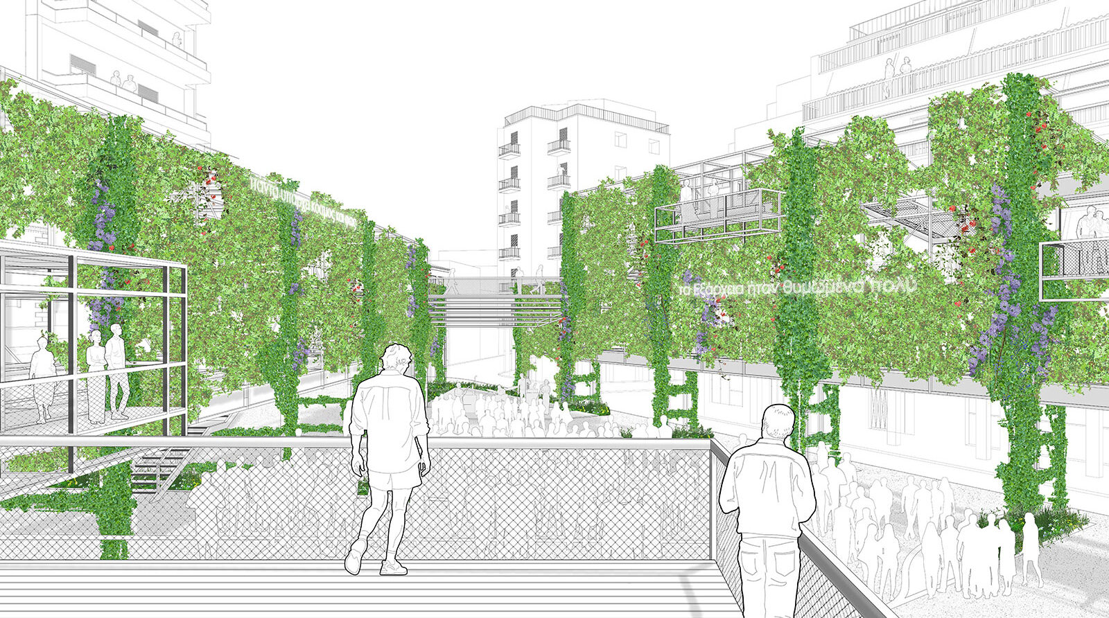 The vertical gardens surrounding the square are a means of absorbing CO2 from the atmosphere, but also a proposal to redefine the identity of Athens’ city centre. The “green scaffolding” aims to become a new landmark for Athens, but also a symbol of the city’s efforts to improve urban resilience through the bioclimatic design of public spaces. The scaffolding structure creates comfortable conditions for pedestrians in shaded areas in the summer and improves wind flow around the perimeter. The vertical sides of the scaffold are covered with dense vegetation to improve solar protection and cooling, while at street level the vegetation is kept sparse to facilitate natural ventilation.
