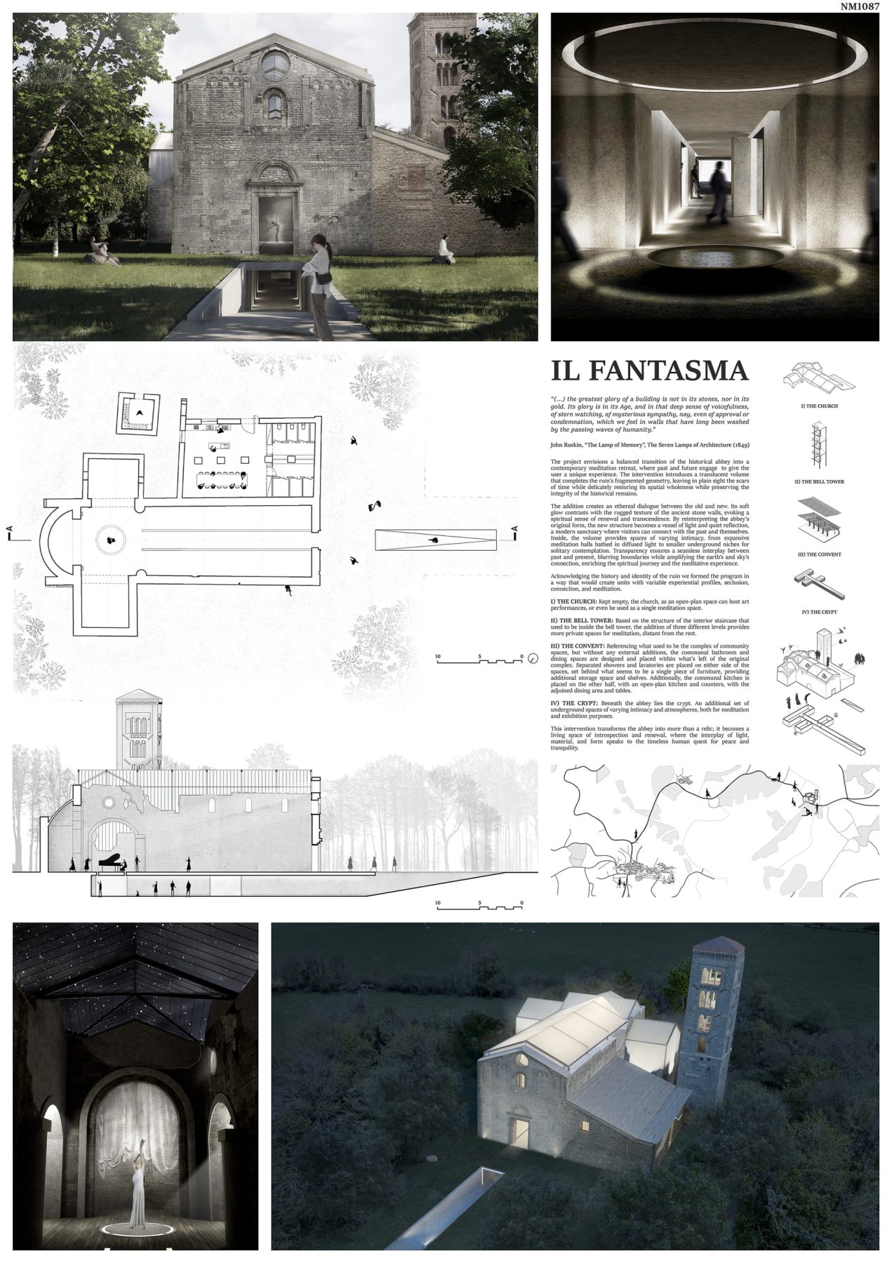 “Il Fantasma – The Revival of the Abbey as a Meditation Sanctuary” is an award-winning project by Maria Mpraikoudi, Ilias Nikolaidis, and Spyros Ntakis, created for the architecture competition ‘Reuse the Abbey’. The proposal envisions a thoughtful transformation of the historic abbey into a contemporary meditation retreat, emphasizing the interplay of natural light and shadow while fostering a dialogue between the old and the new.
