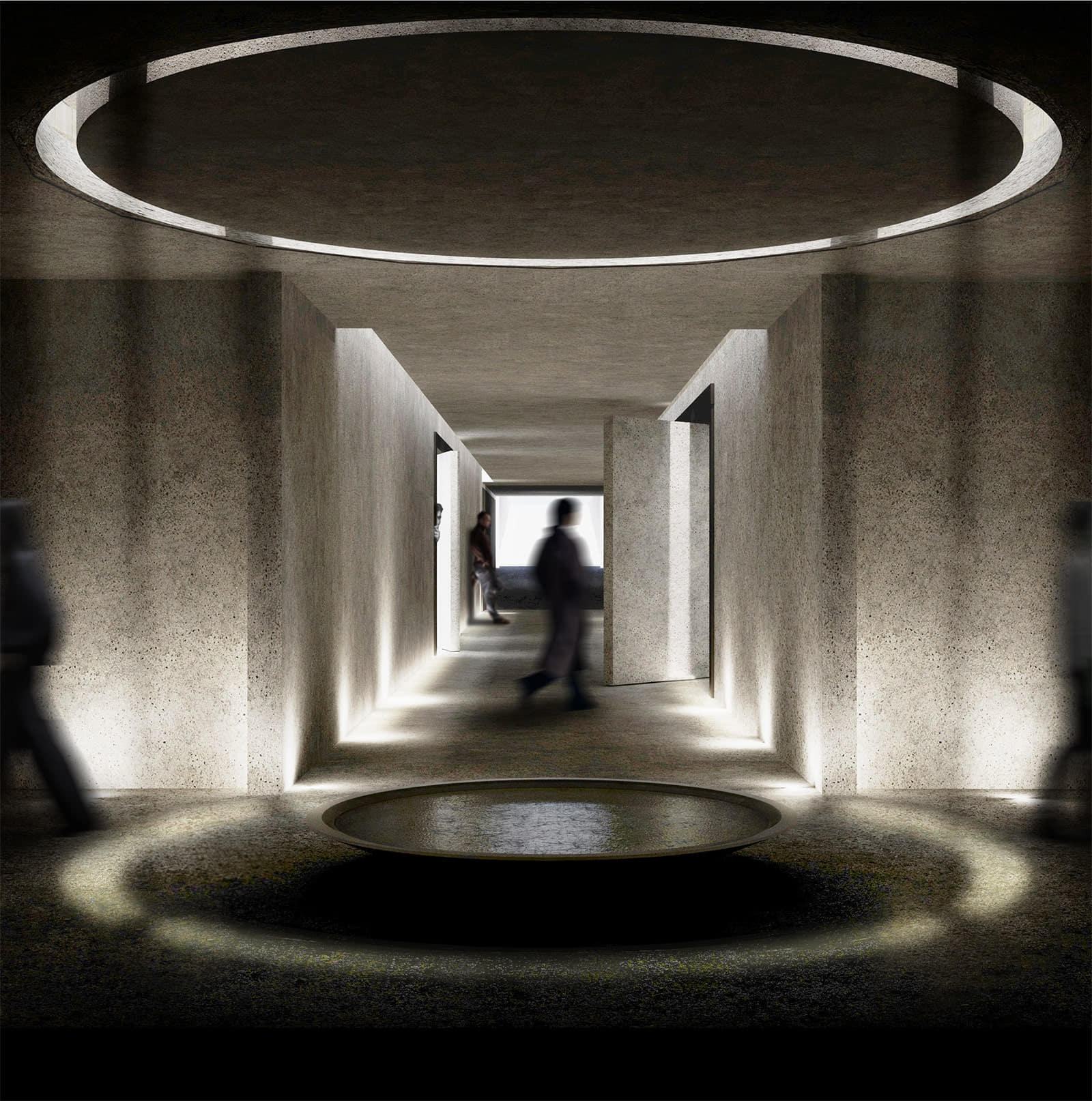 Inside, the volume provides spaces of varying intimacy, from expansive meditation halls bathed in diffused light to smaller underground niches for solitary contemplation.