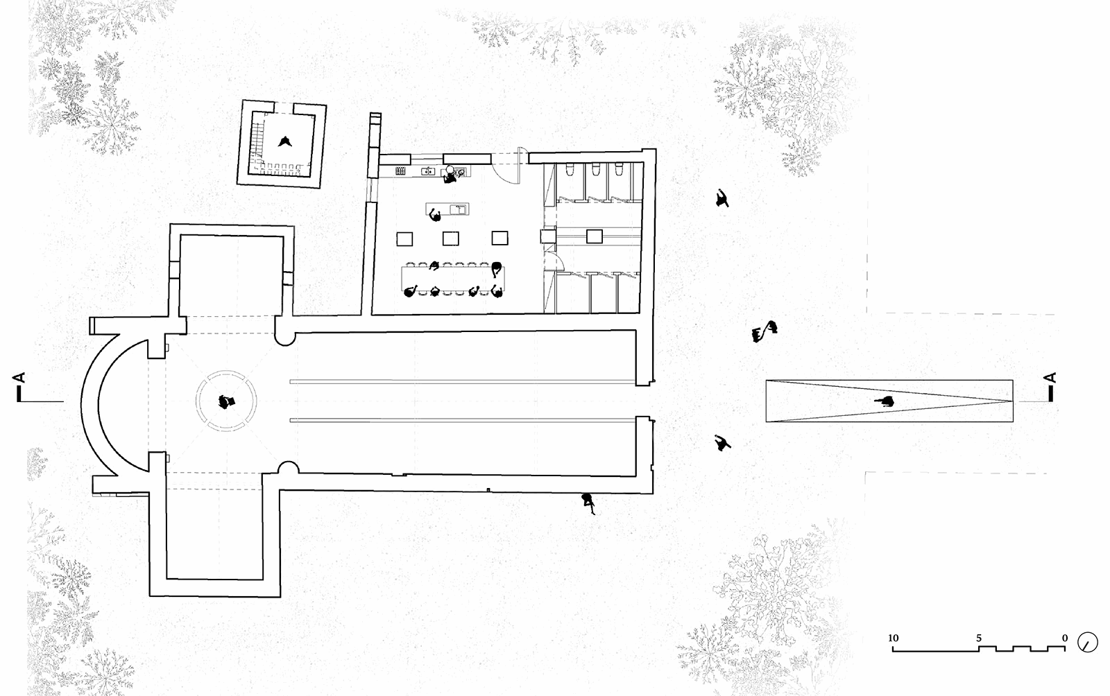 - The crypt: Beneath the abbey lies the crypt. An additional set of underground spaces of varying intimacy and atmospheres, both for meditation and exhibition purposes.