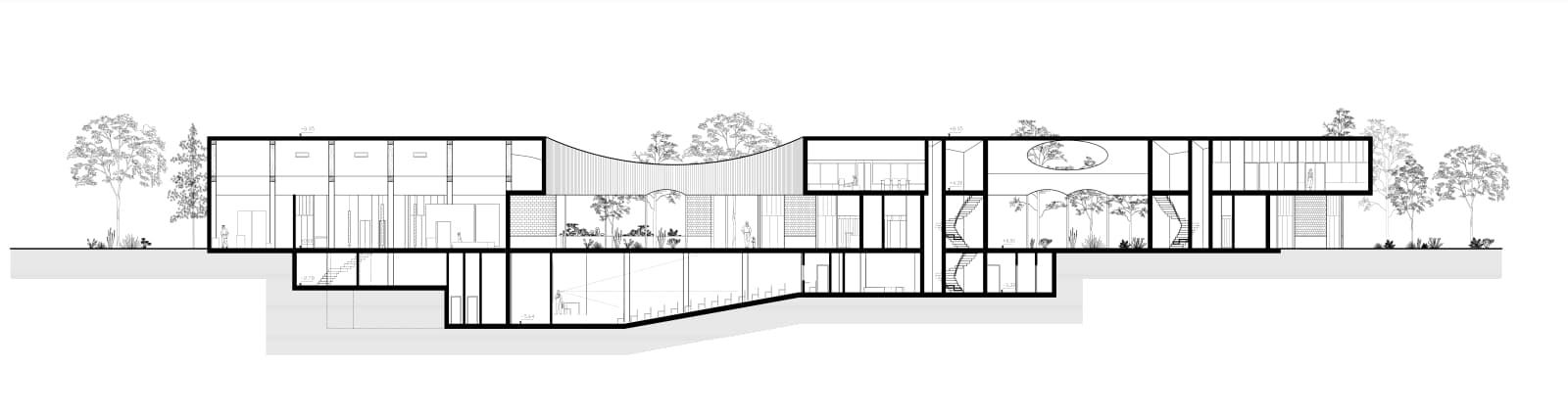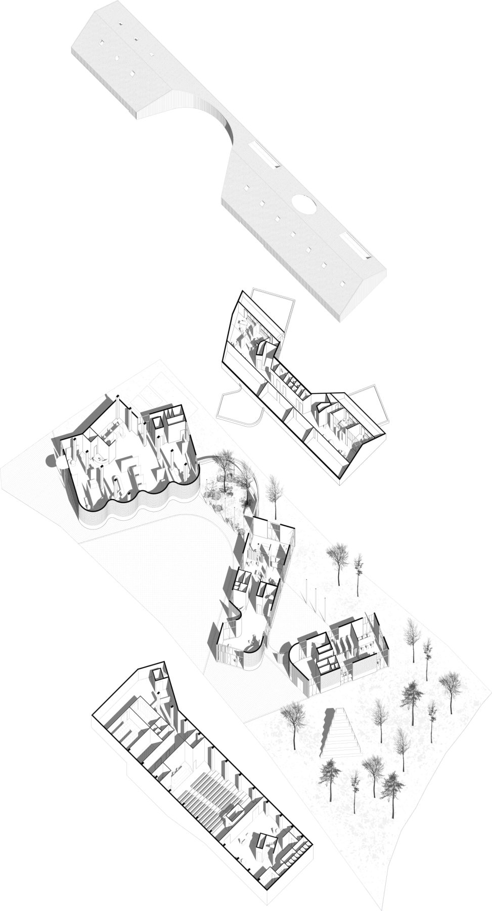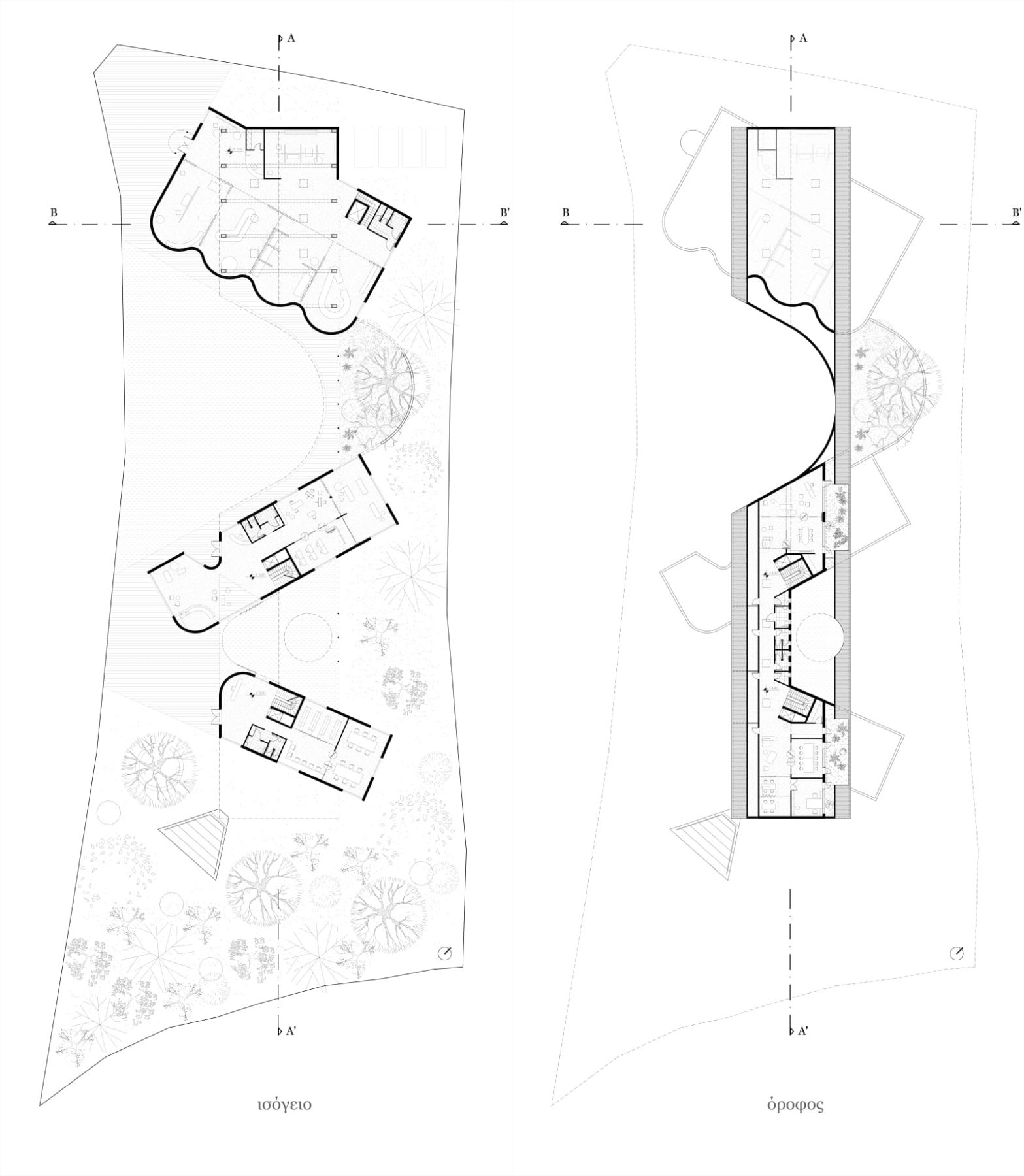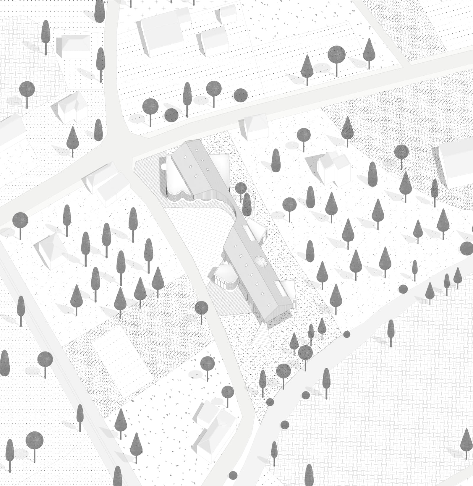 The main shape and the materiality of the overlying volume of the proposal therefore, arise as a reference to this typology with the aim on the one hand to better intergrade the building to its surroundings and on the other hand to creation a distinct morphological character through the counterpoint between the split volumes of the ground floor and the single long narrow volume of the upper level.