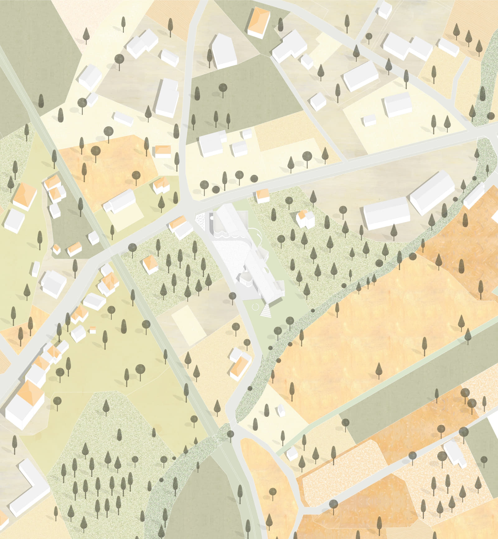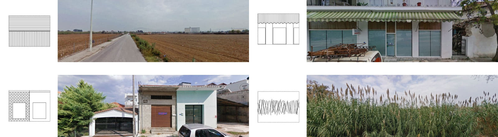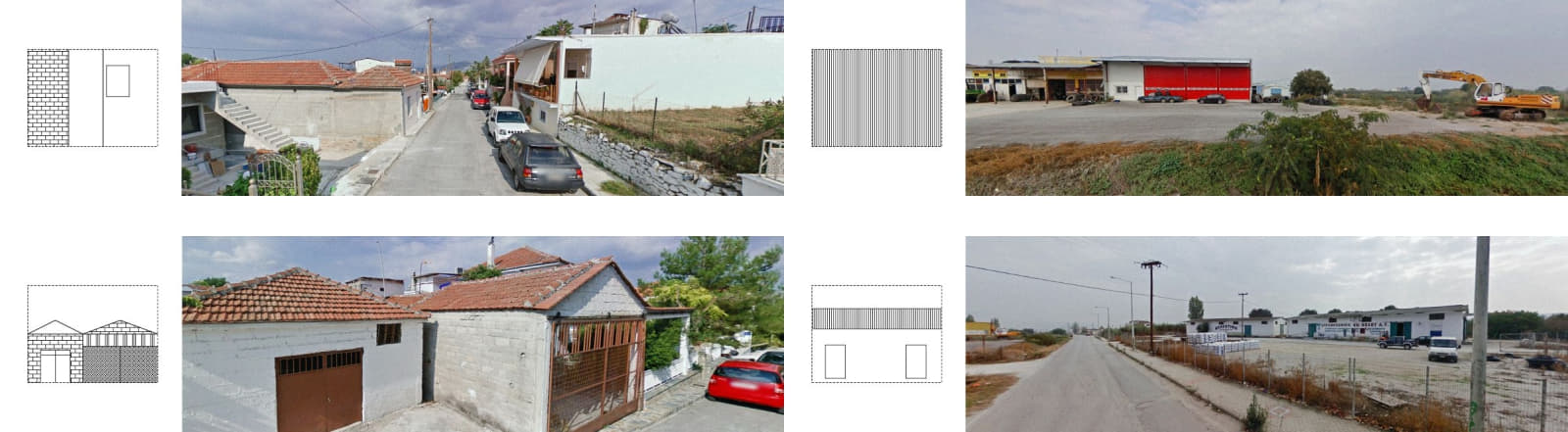 This becomes exemplified by the presence of several agricultural warehouses and their typology: Long narrow buildings with gabled roofs where their outer surface is defined by metal panels and sheets.