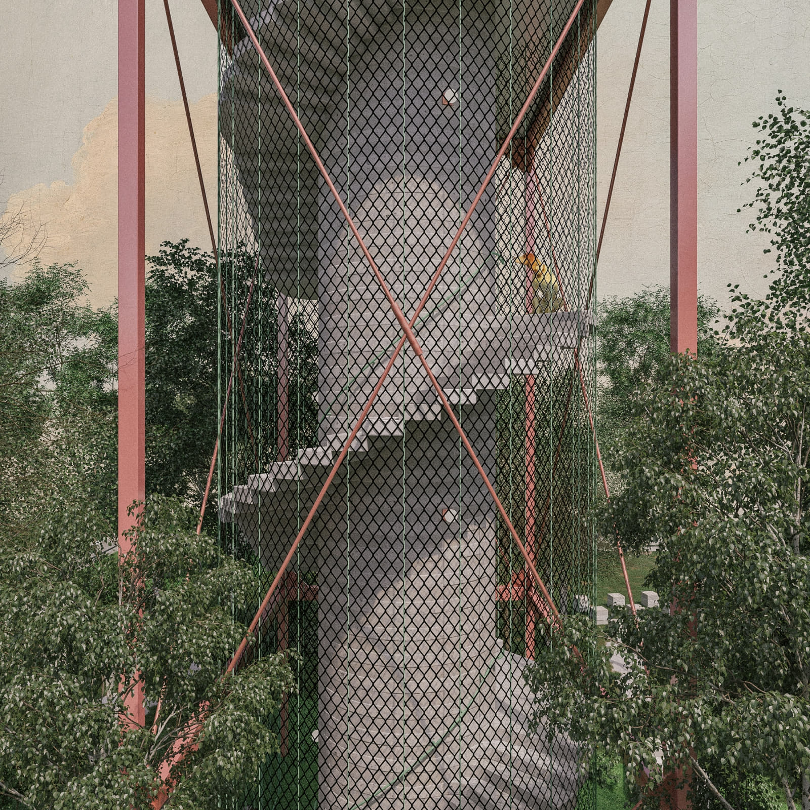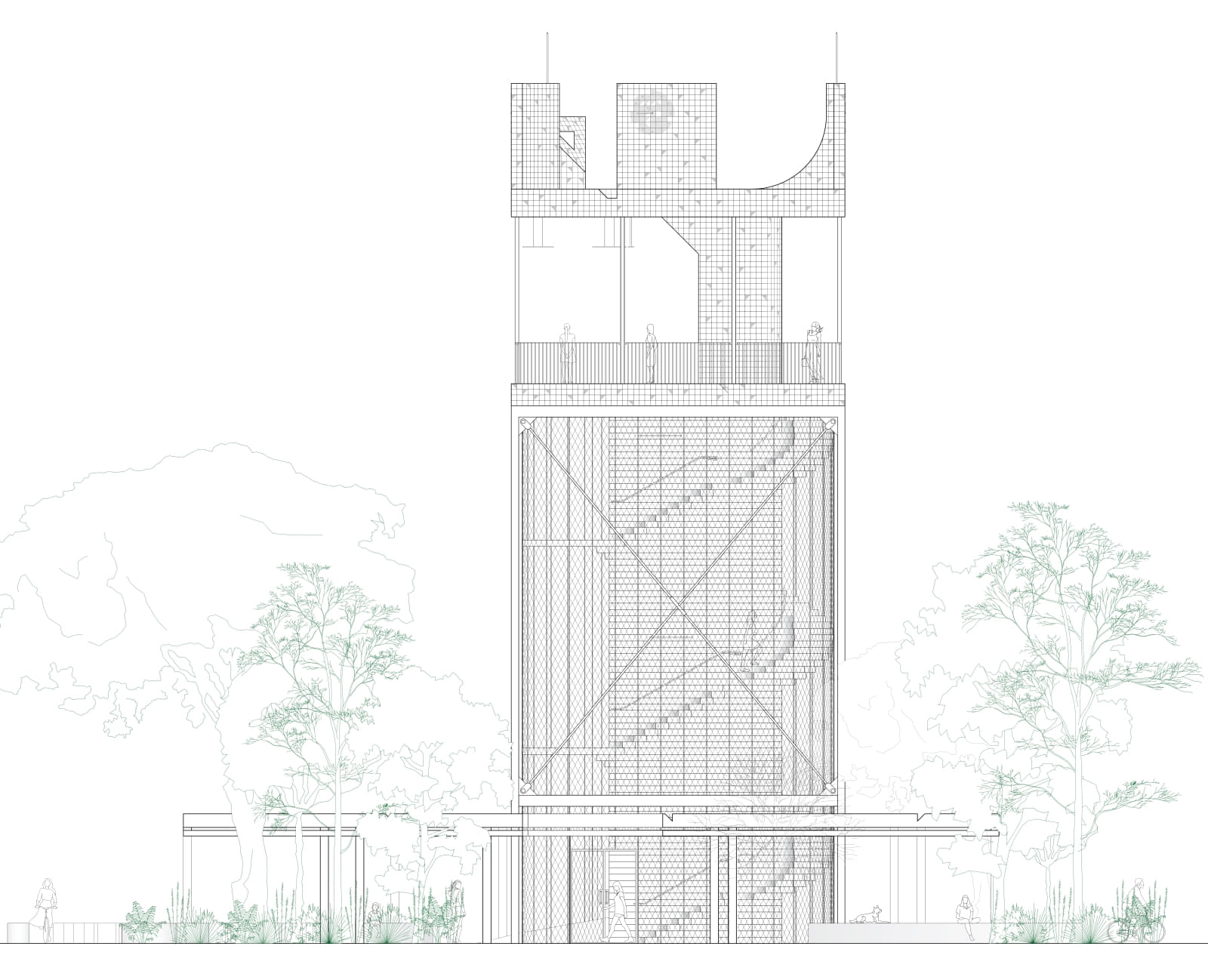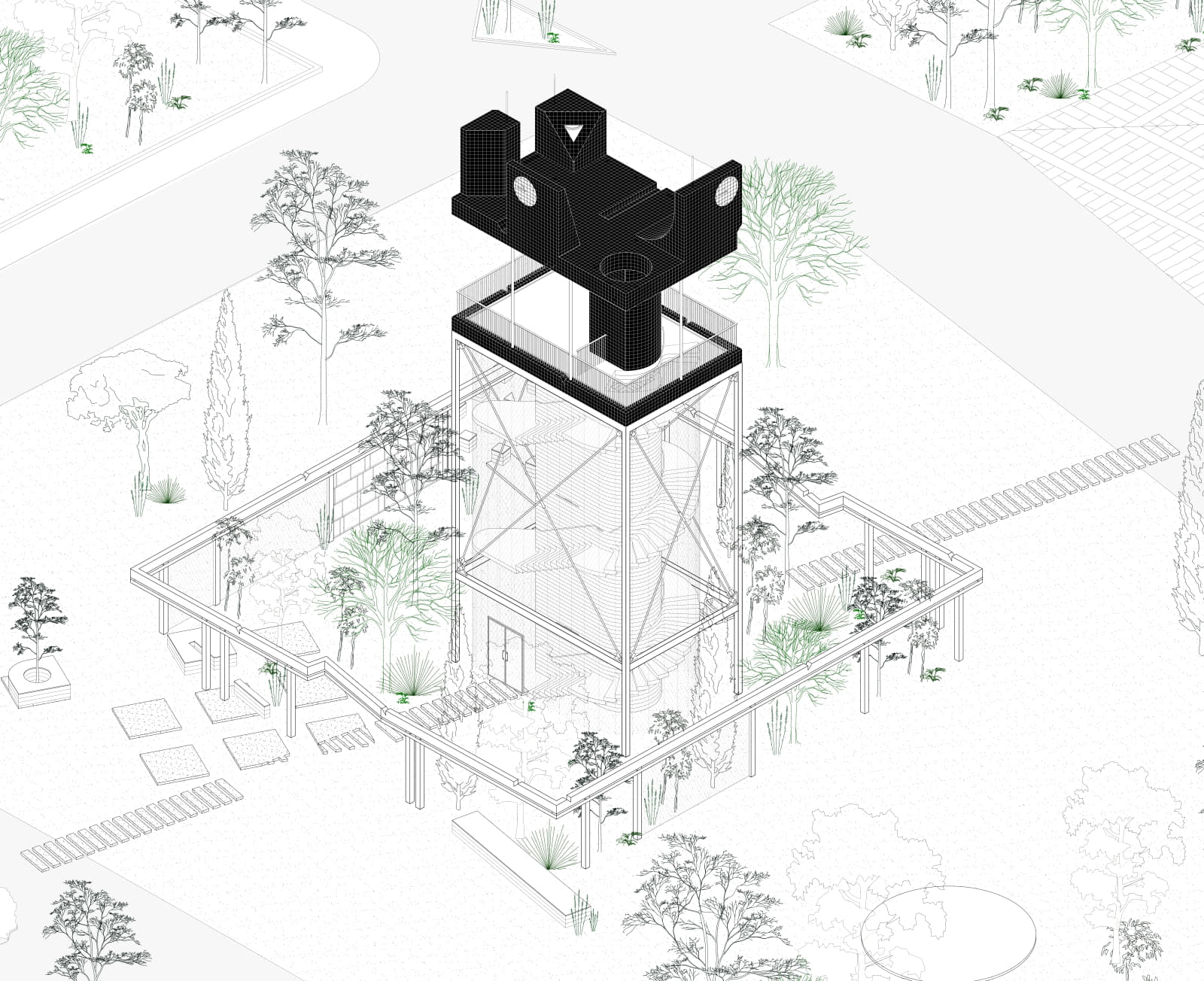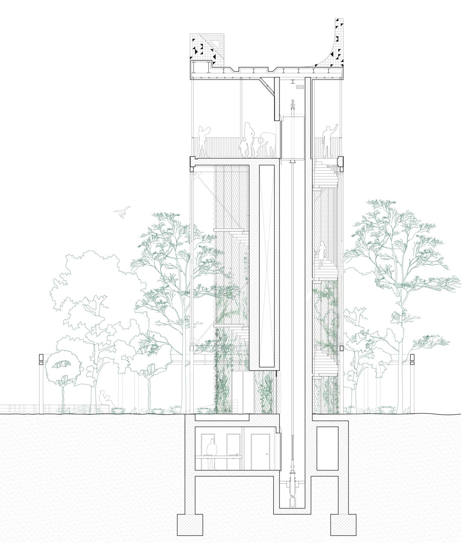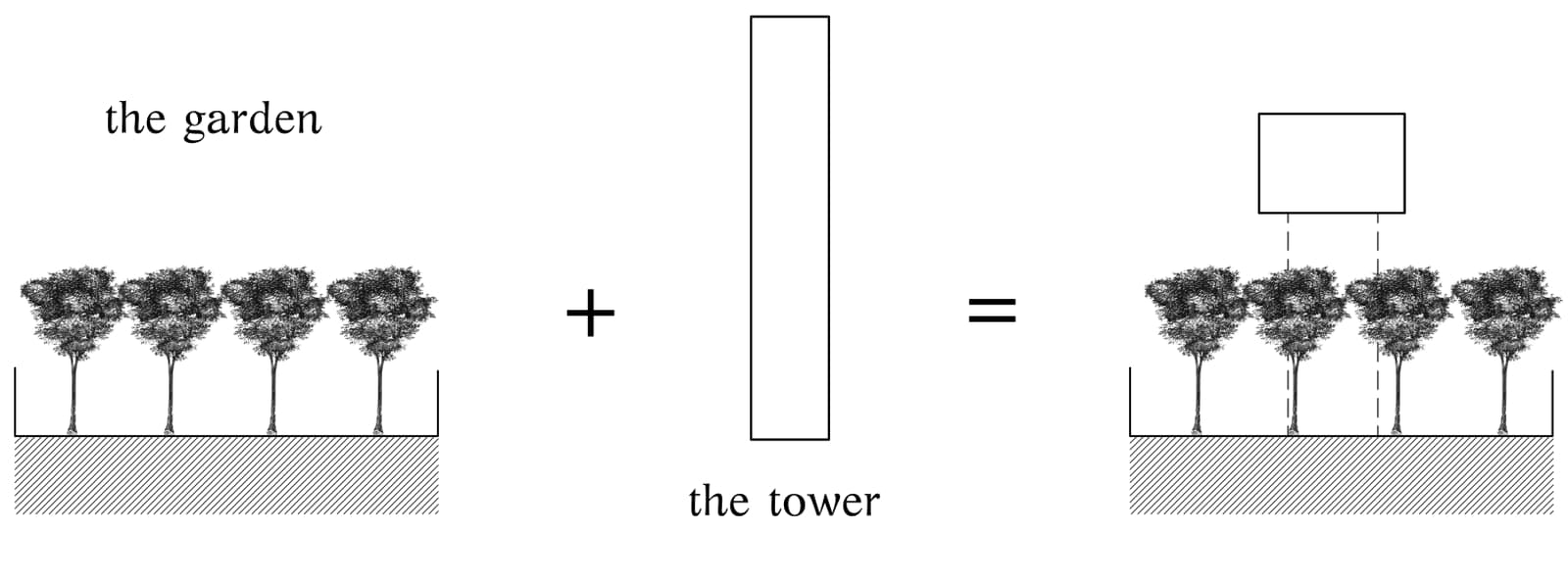 The proposal, having to deal with a tower-shaped structure by definition, chooses to merge the two archetypes: the base of the tower is replaced by a garden that essentially challenges the dominance and the very foundation of the tower.