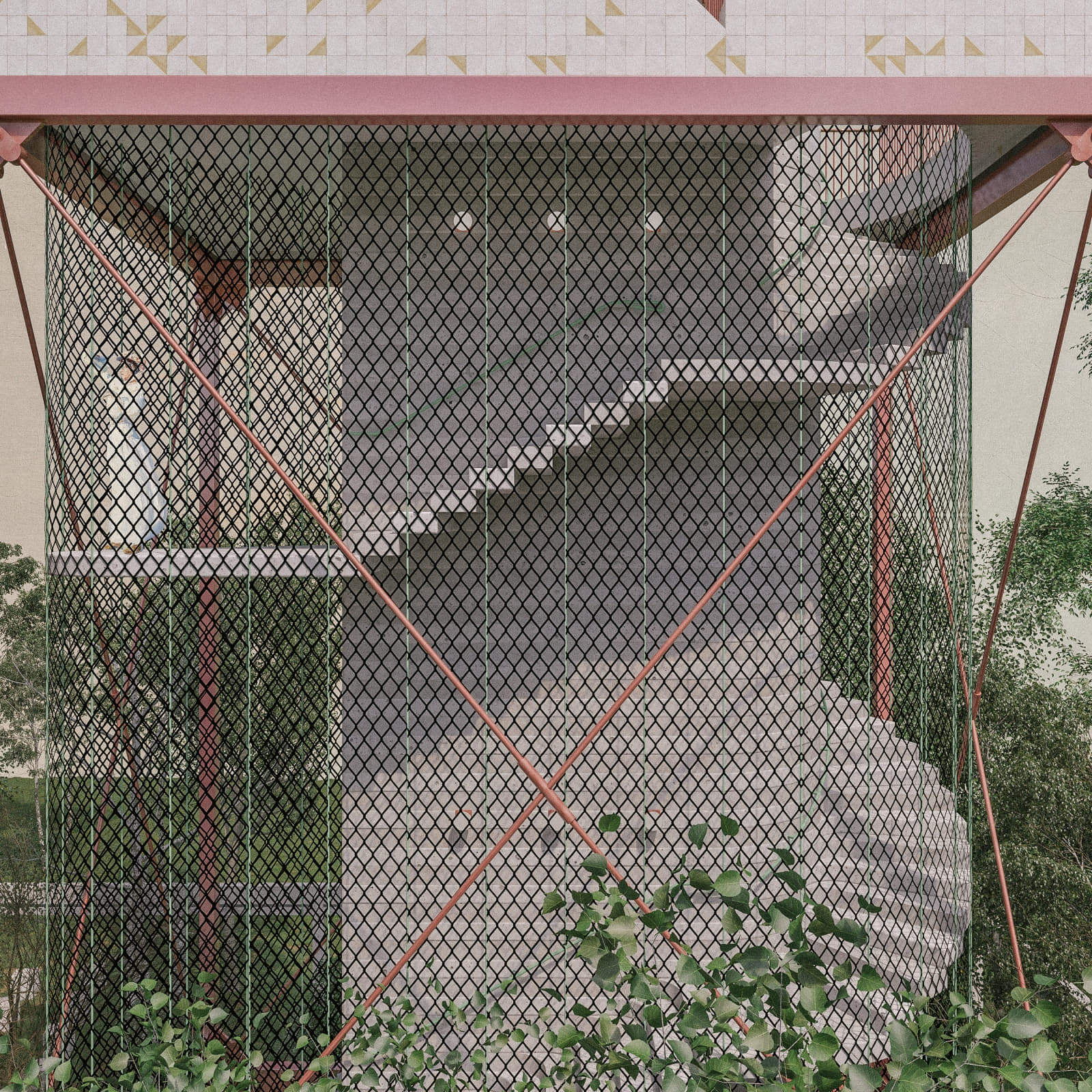 Στο εξωτερικό μέρος της σκάλας τοποθετείται πλέγμα που επιτρέπει σε αναρριχόμενα φυτά να το καταλάβουν εξαφανίζοντας ακόμα περισσότερο την υπόσταση της κατασκευής στα χαμηλότερα σημεία της.