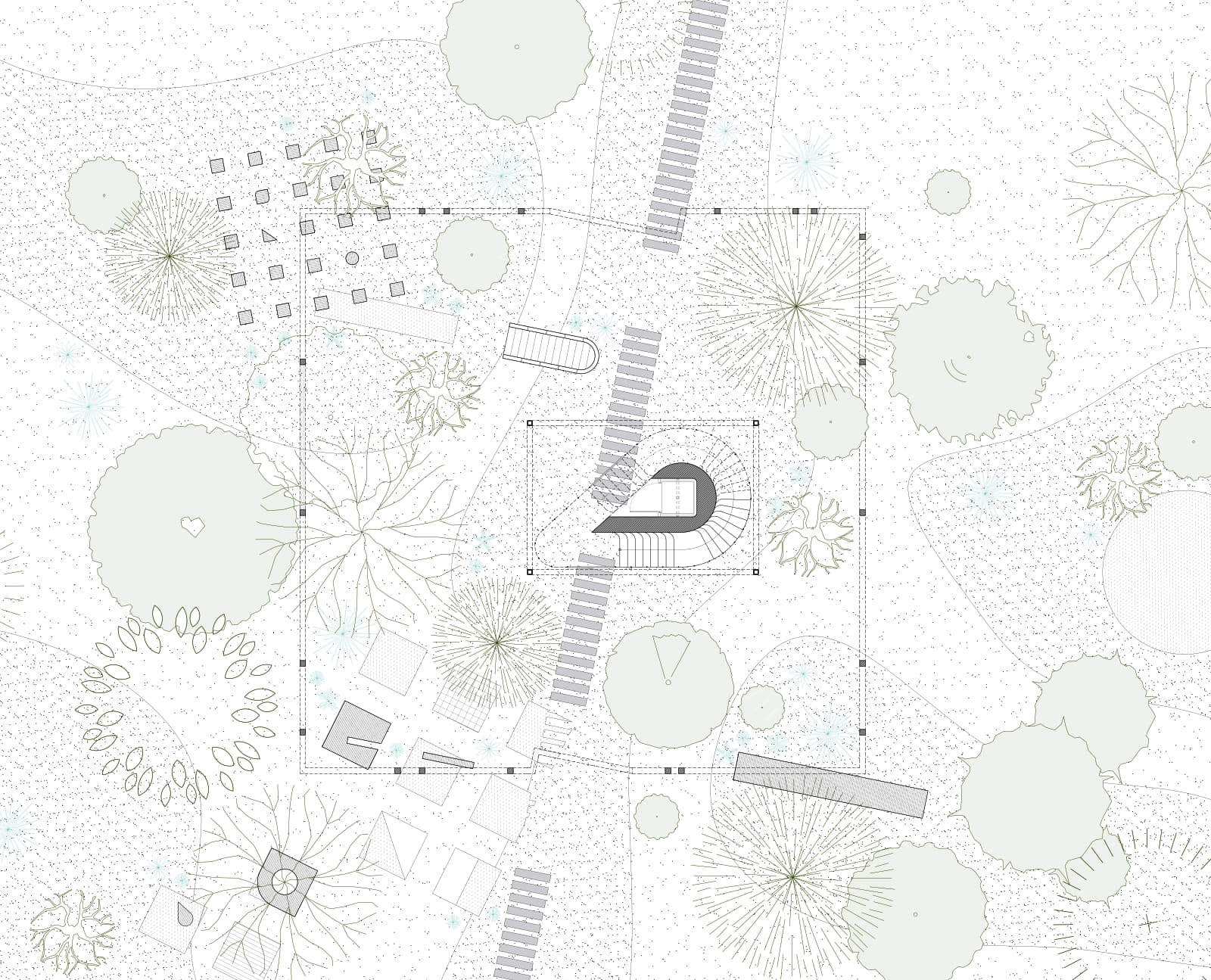Thus, the vertical line that the structure would have originally been, is transformed into an element that seems to float above the garden – in essence, as if it emerges from it.
