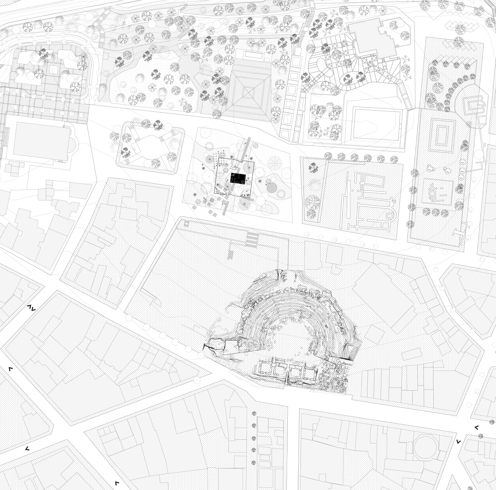 The proposal attempts to express precisely this unifying condition intended by Rigas Feraios, in architectural terms: a set of different volumes – of different size, shape, and orientation – on the ground floor supports a more unified volume located above them on a second level.