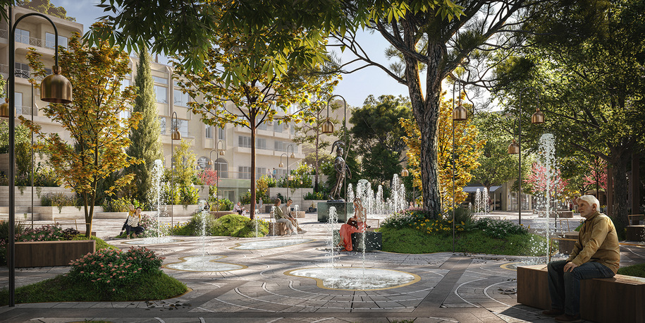 The design of the lighting fixtures as brass bells refers to the Byzantine history of the area, while timber and marble seating equipment is positioned in a way to follow the paving pattern.