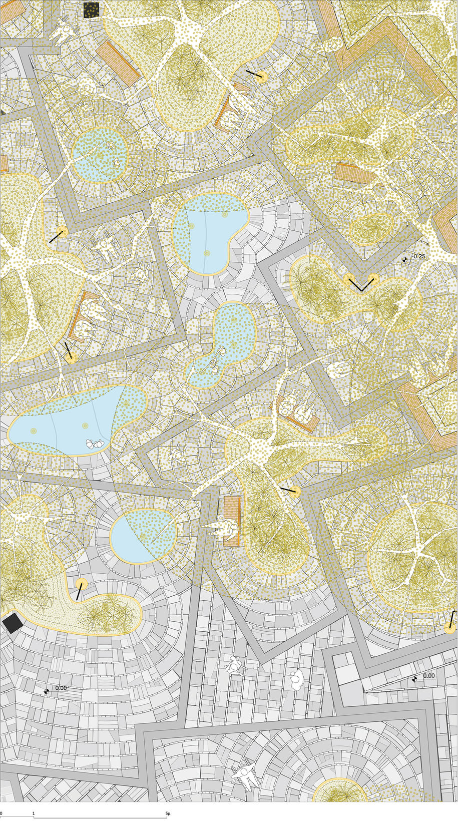 These reshaped parts consist of a zone of exposed concrete at their perimeter, while their inner segment of sequential parallel zones of local stones and marbles that are either new or recycled from the site.