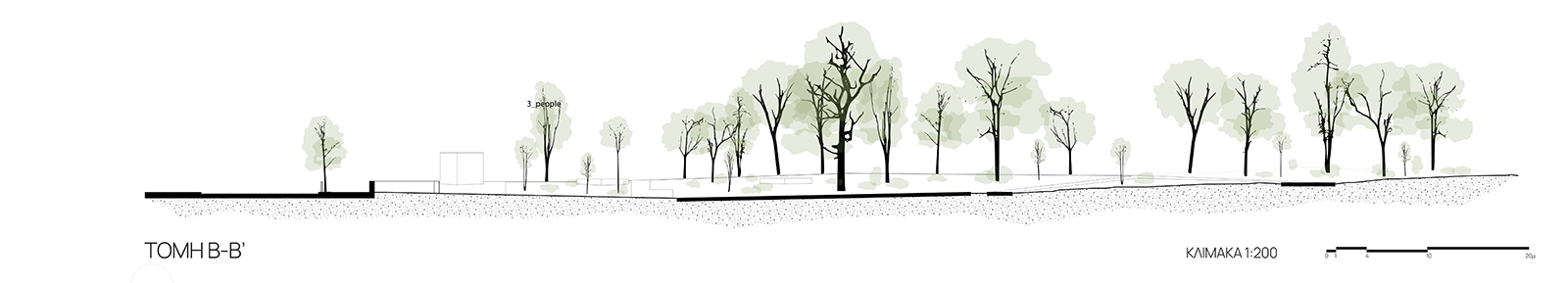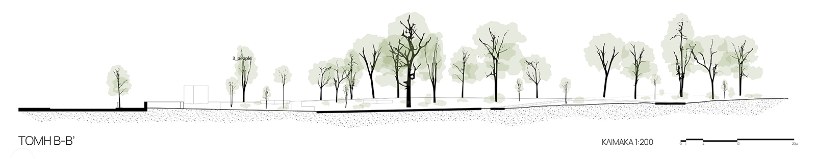 The park’s role as a hub of urban mobility is strategically reinforced by delineating new paths and preserving existing routes, while subtle design manipulations, near the human scale, aesthetically enhance the area. Mild architectural interventions, stretching to the limits of necessity, and the reorganization of greenery, following the subway excavation works, emphasize the functioning of the park as an urban grove, while the reuse of existing materials contributes in sustaining a minimal ecological footprint. On a city planning scale, Rizari Street is converted into a low-traffic street securing the most efficient link between the park and the city’s network of green public spaces.