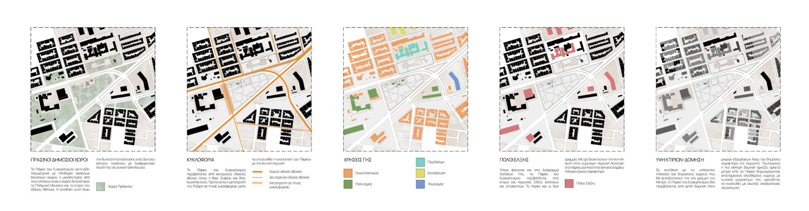 Η περιοχή του Ευαγγελισμού χαρακτηρίζεται ως ένα πολυδύναμο κέντρο για την Αθήνα, ένα καθοριστικό σημείο αστικής κινητικότητας που αναδιανέμει κινήσεις και ροές πεζών και οχημάτων. Σε άμεση γειτνίαση συναντάμε μία σειρά δημόσιων χρήσεων και κτιρίων, σημαντικούς οδικούς άξονες, προσβάσεις στα αστικά ΜΜΜ και εκτενείς ελεύθερους χώρους πρασίνου εντοπισμένους σε ένα συνεχές δίκτυο. Αυτή η παράδοξη αιώρηση ανάμεσα στην έννοια του κόμβου, όπου συγκλίνουν και συμπλέκονται πολλαπλές ροές, και της νησίδας, ως μιας περιοχής αποκλεισμένης περιμετρικά από κεντρικούς οδικούς άξονες, θέτει ένα δύσκολο όσο και γοητευτικό αρχιτεκτονικό πρόβλημα.
