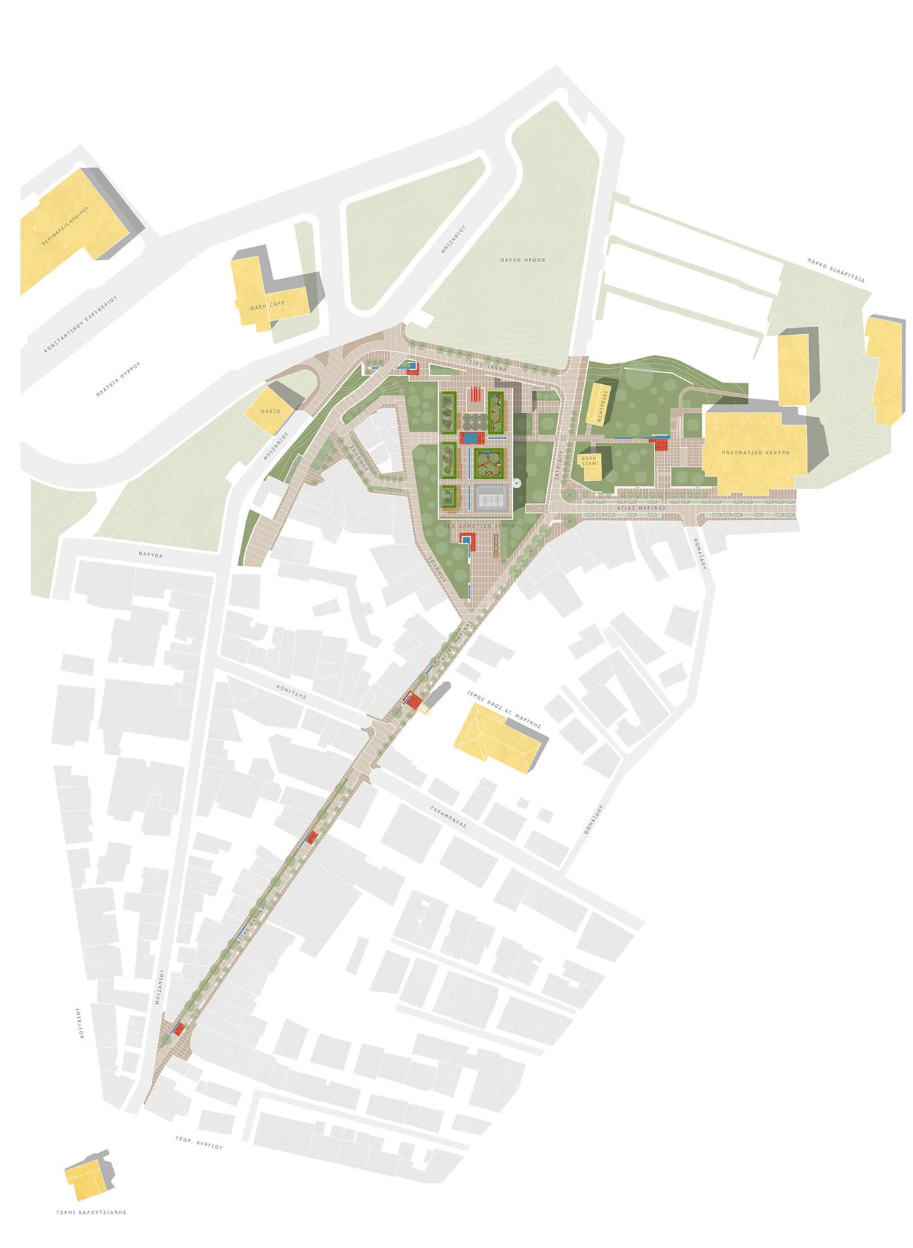 Για την ανάδειξη αυτών των στοιχείων και την αποκατάσταση της αντιληπτικής συνέχειας του δημόσιου χώρου, προτείνεται η διαμόρφωση ενός πλέγματος επτά πλατωμάτων με κοινά αρχιτεκτονικά χαρακτηριστικά.