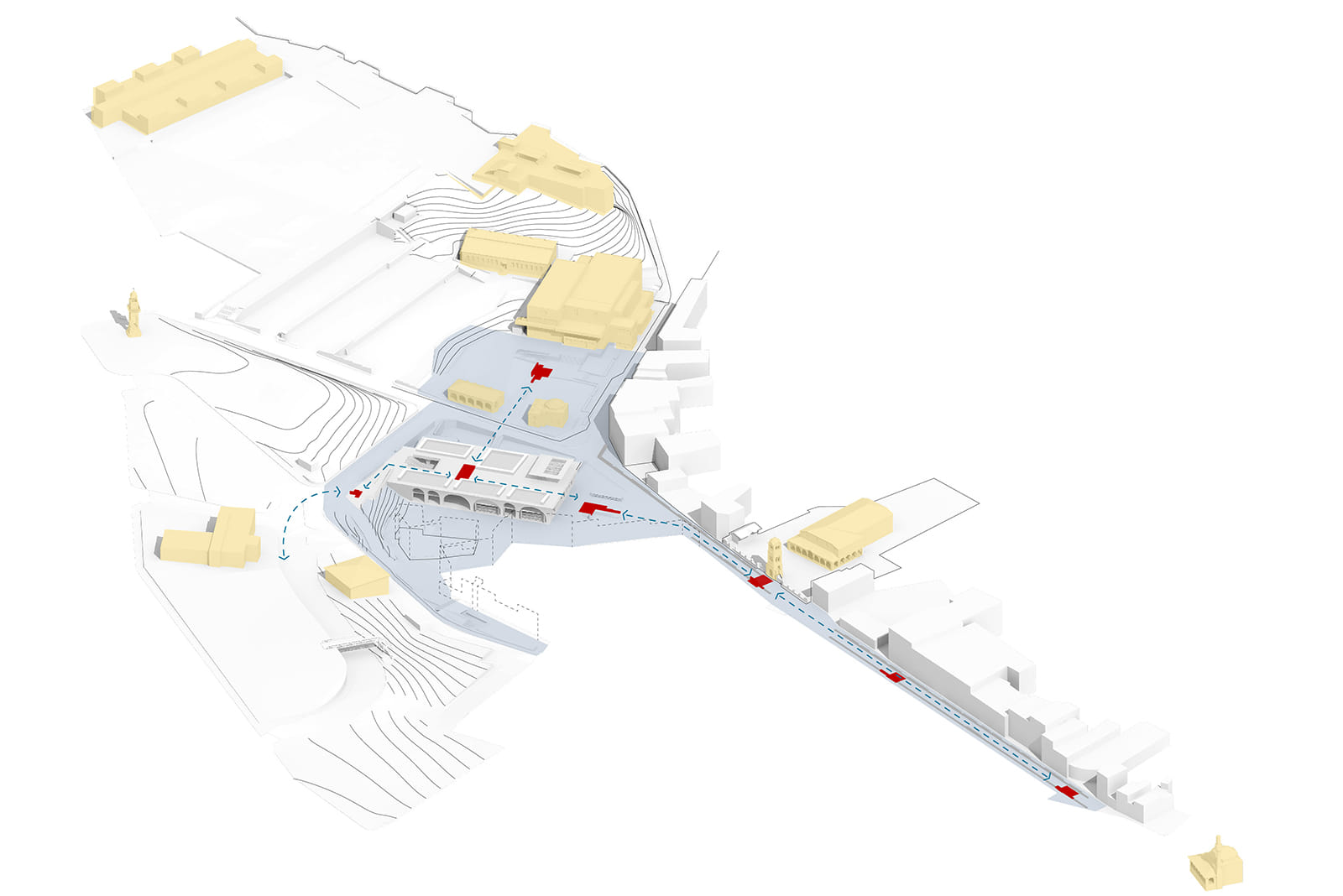 Το σύνολο αυτό λειτουργεί ως ο βασικός πυρήνας μιας ευρύτερης αστικής ανάπλασης, η οποία δεν περιορίζεται στο κτίριο αλλά επεκτείνεται στη γύρω περιοχή.