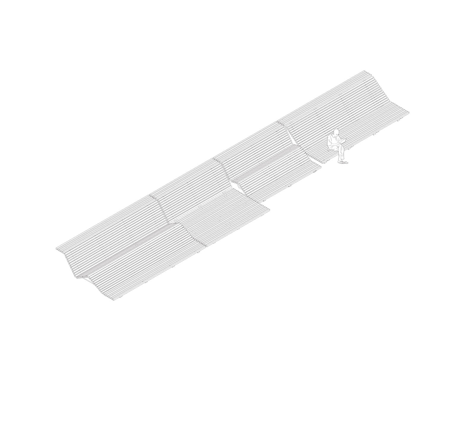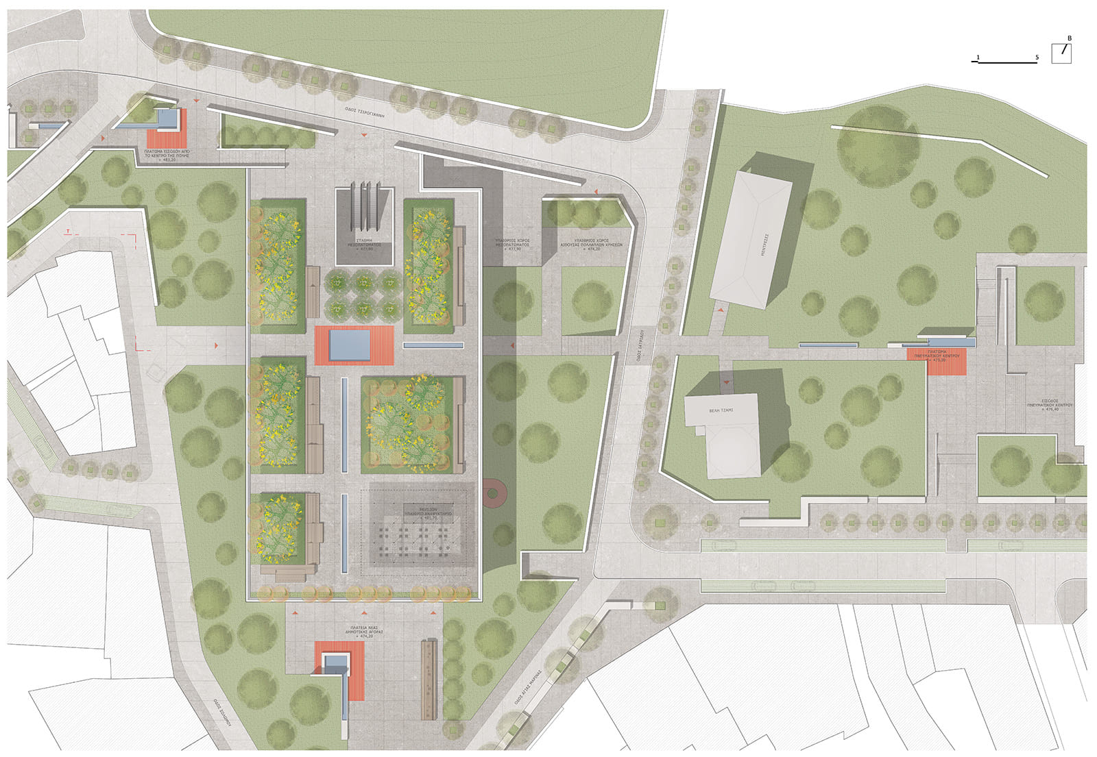 Its layout is organized around two linear water channels, which suggest the extension of public space toward Agia Marina Street and toward the Cultural Center respectively, turning the roof into an active part of the urban experience.
