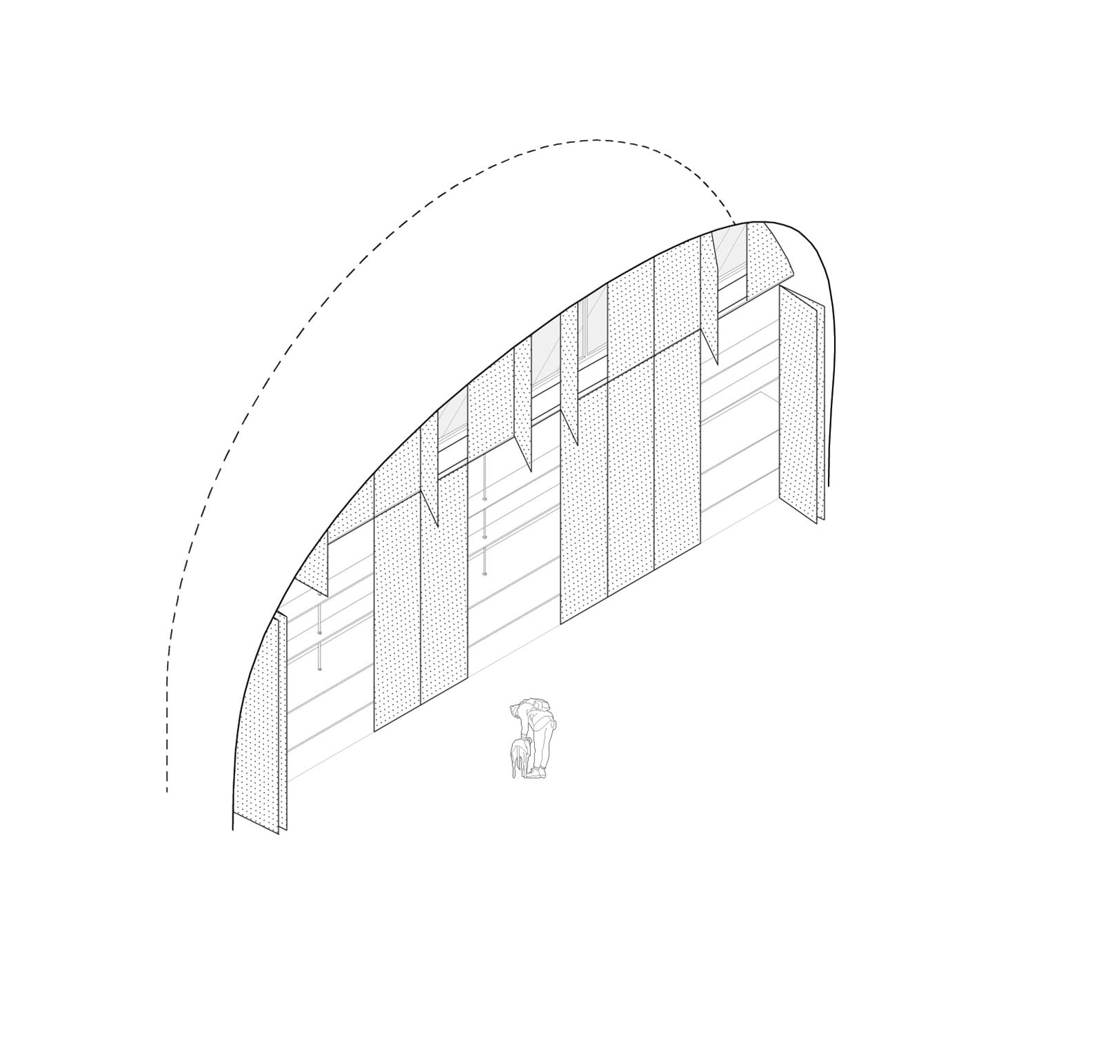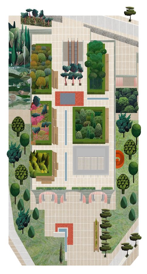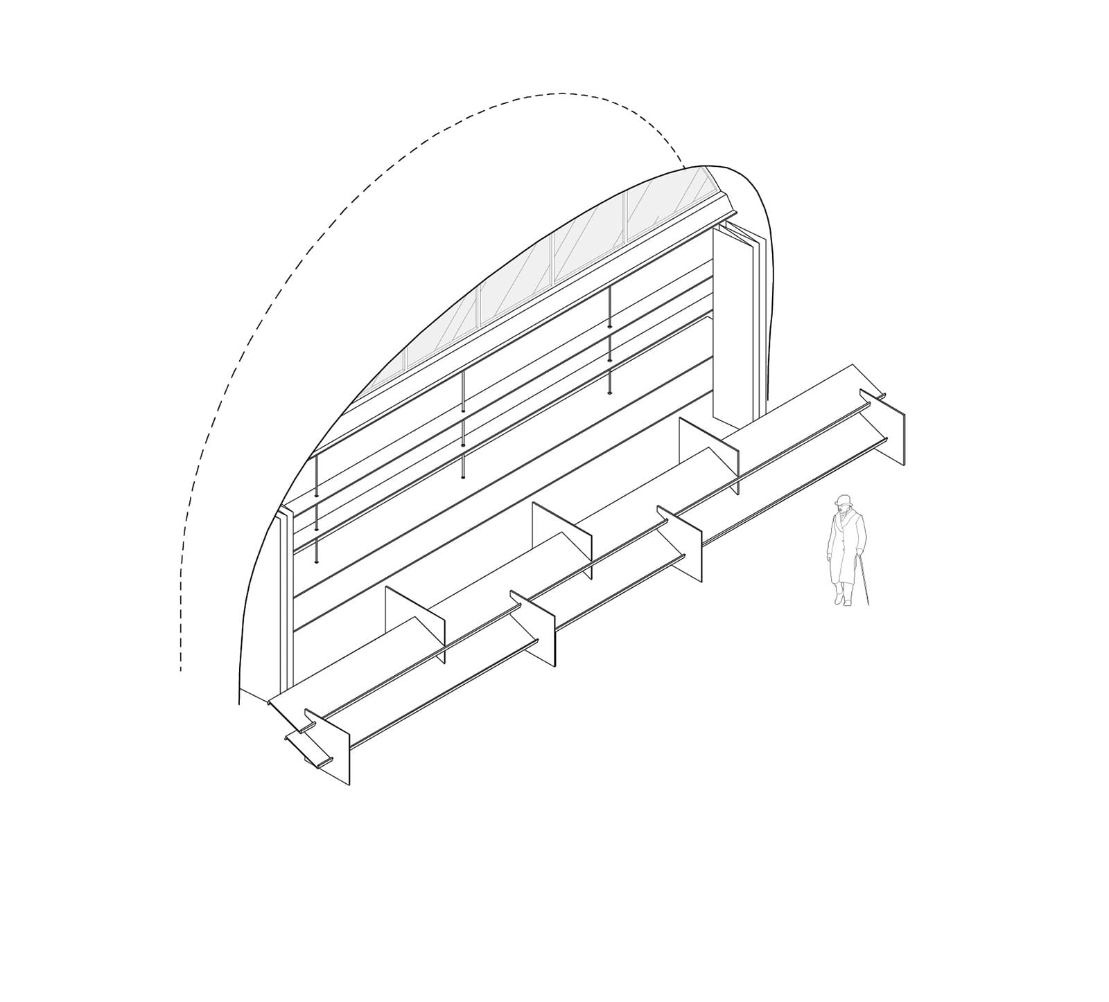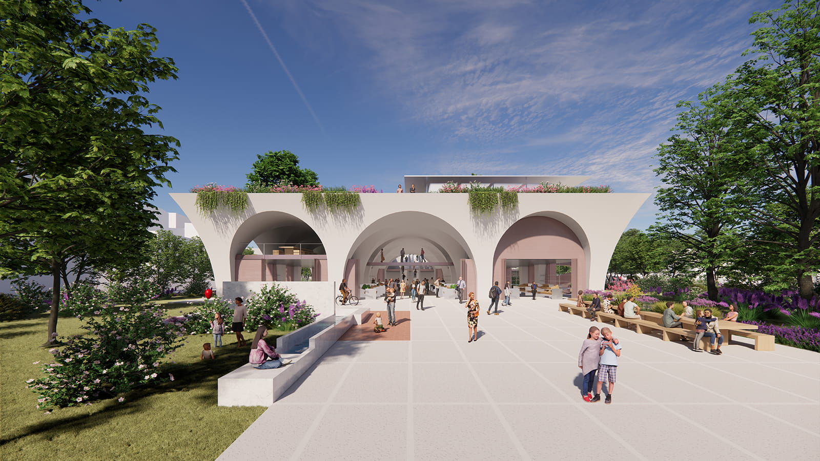 Above the vaulted structure, the roof of the building is transformed into an elevated urban garden.