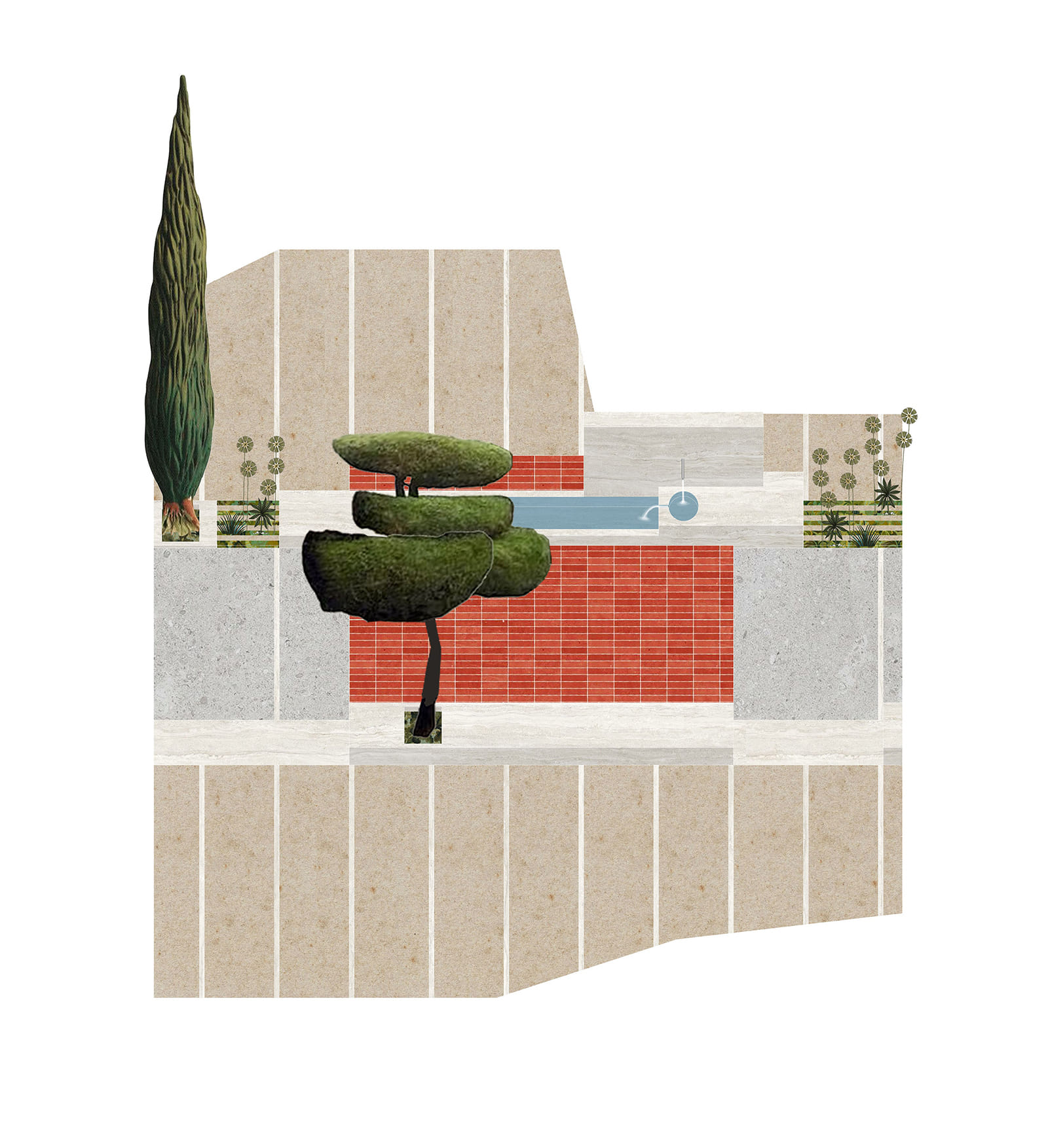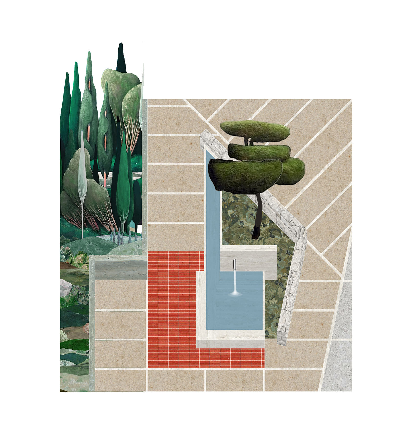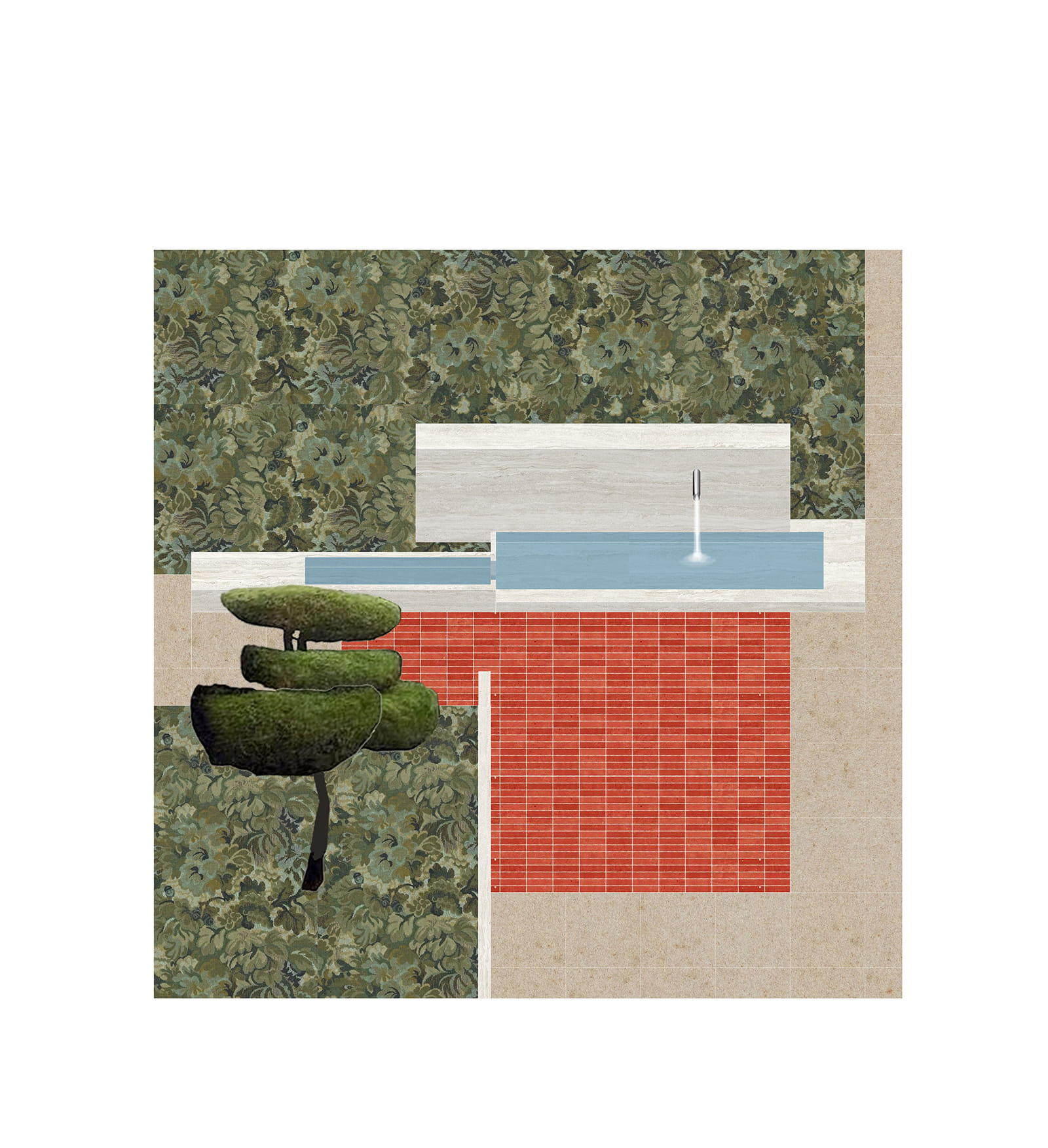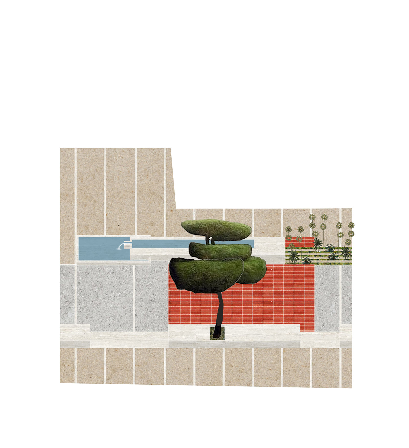 Each one incorporates a small-scale water surface or fountain, while the primary paving material is red ceramic tile. Water also appears in linear form, connecting the plazas and acting as both a spatial and conceptual guide.