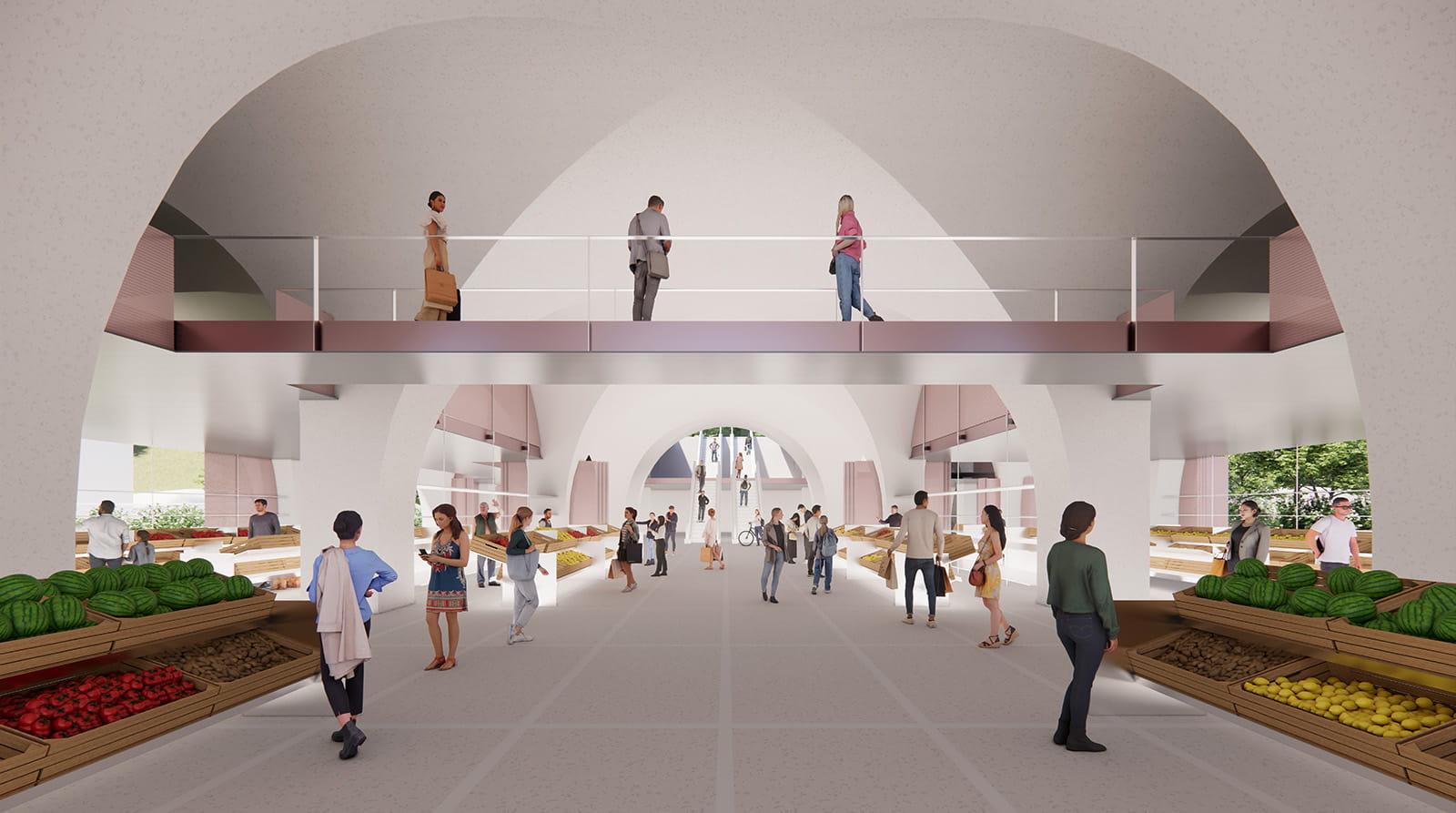 The vaulted envelope of the Market, the elevated garden, and the new square form a unified architectural and urban ensemble.