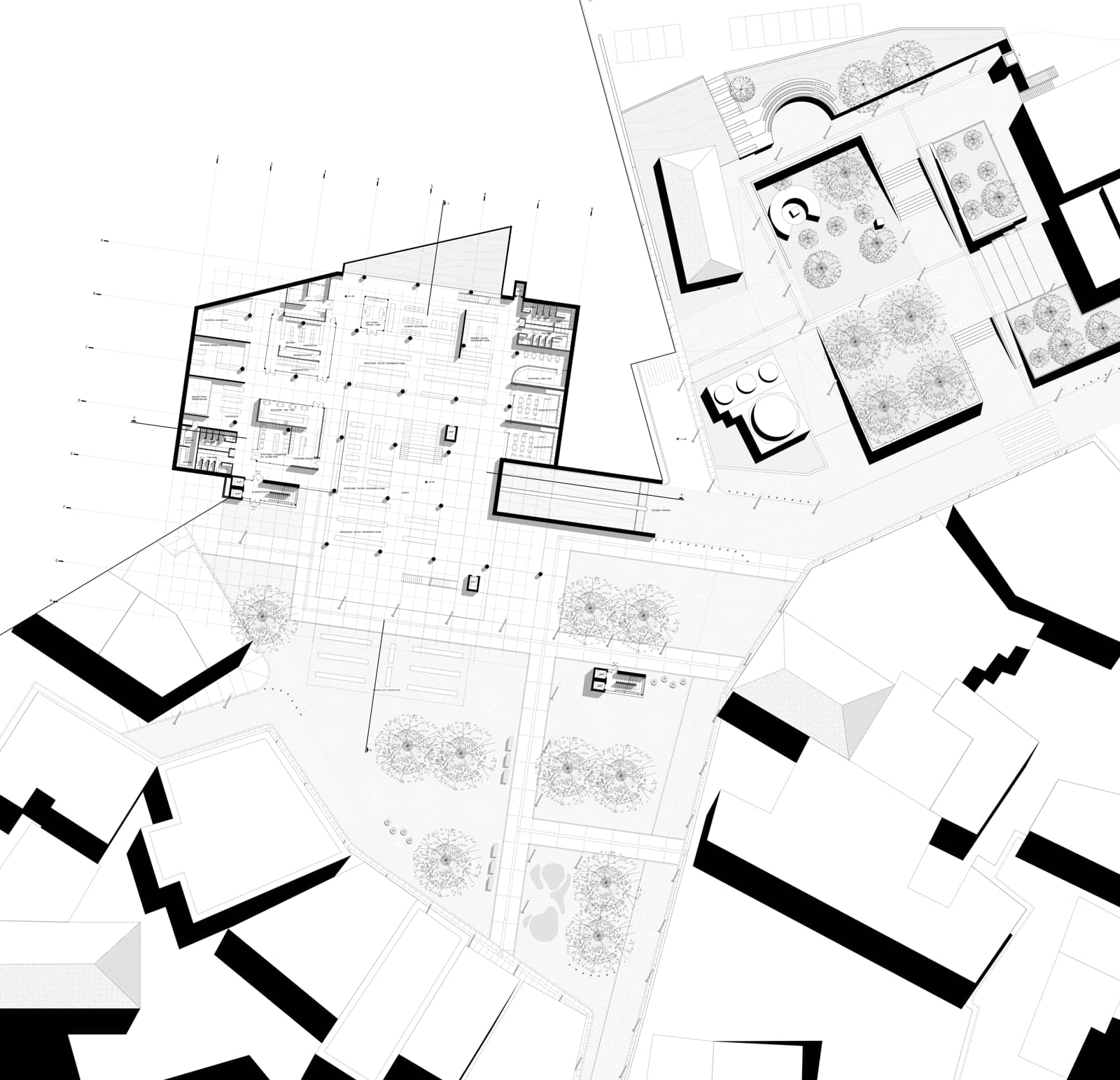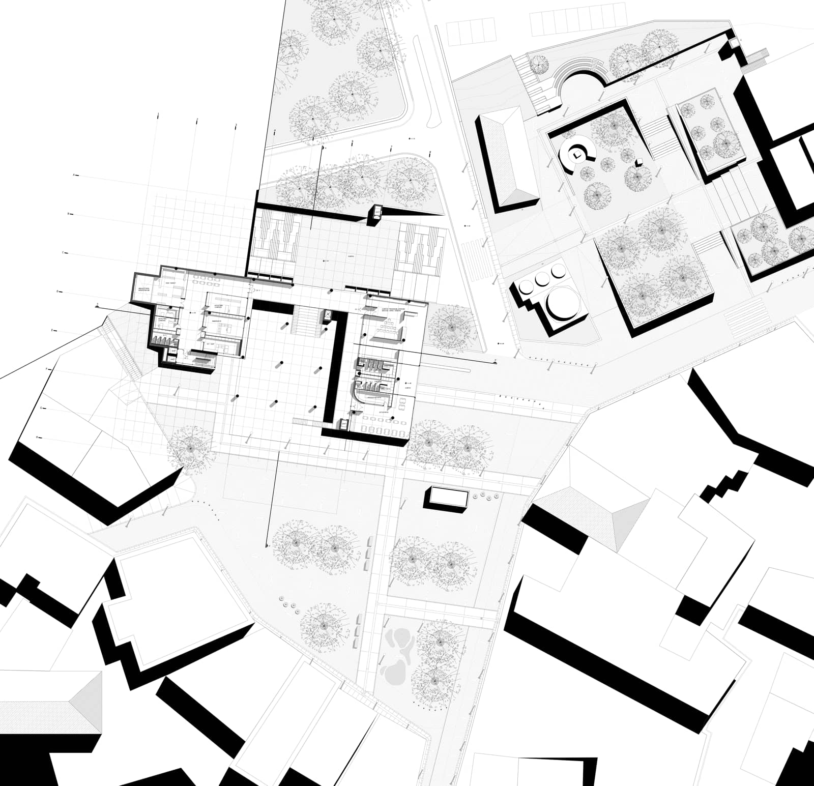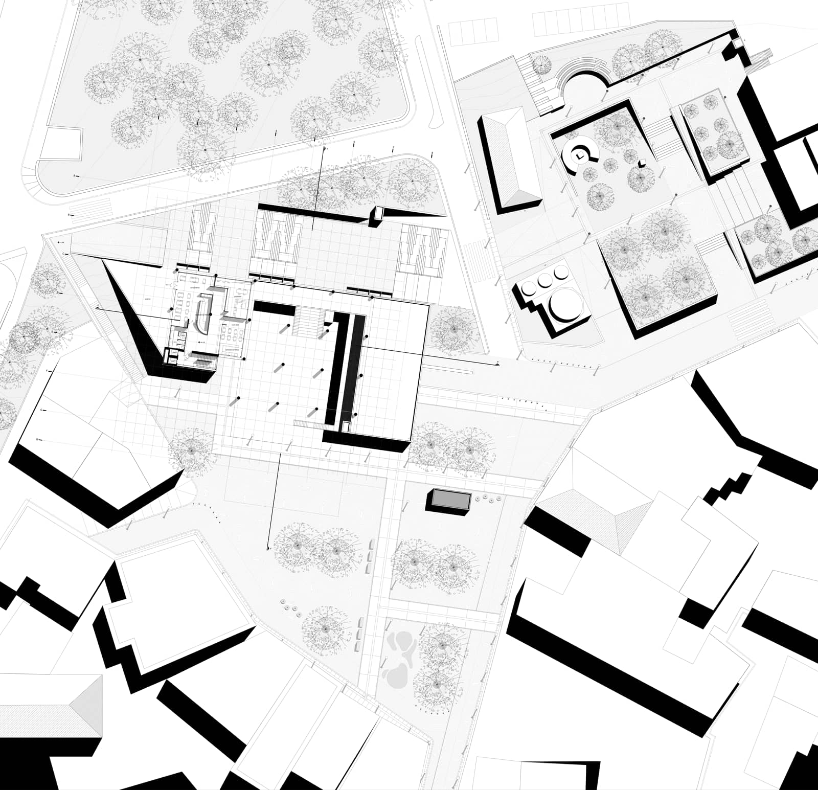 Existing buildings and open spaces are treated with a focus on coherence and flow. The entire design is a permeable, layered composition, with gentle transitions between hard and soft surfaces, vegetation, and shaded areas. This approach highlights the daily rhythms of urban life while ensuring multiple points of access and circulation.