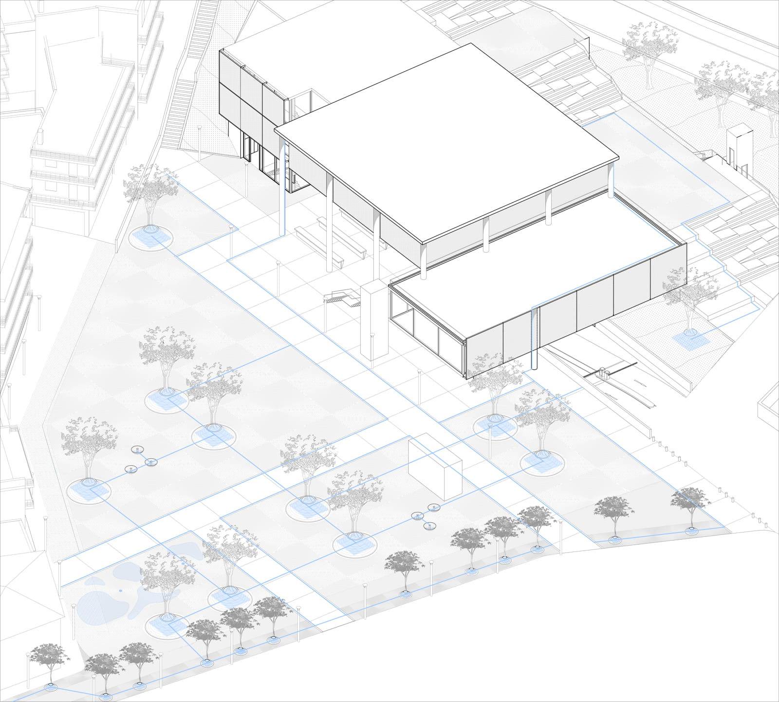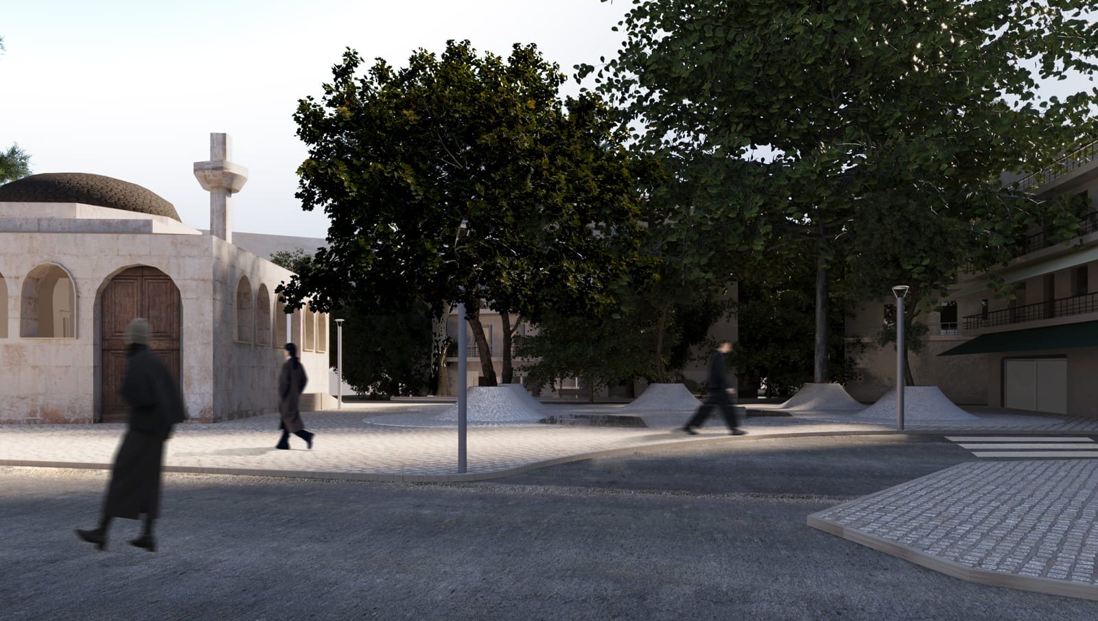 Η αντιμετώπιση των υφιστάμενων κτισμάτων και των ελεύθερων χώρων γίνεται με όρους συνοχής και συνέχειας. Το σύνολο σχεδιάζεται ως μία διαπερατή τοπιακή σύνθεση, με ήπιες μεταβάσεις μεταξύ σκληρού και μαλακού δαπέδου, βλάστησης και σκίασης, αναδεικνύοντας την καθημερινή ροή των πολιτών και εξασφαλίζοντας πολλαπλές προσβάσεις και διασχίσεις.