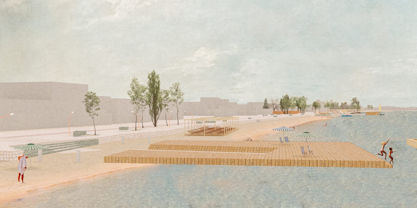 At the heart of the proposal lies a continuous promenade running along the shoreline. Designed primarily for pedestrians and cyclists, it minimizes vehicular traffic and is complemented by cross-streets converted into pedestrian routes.