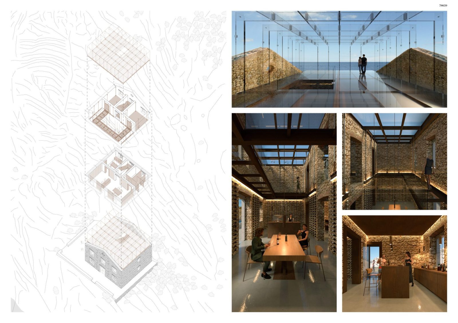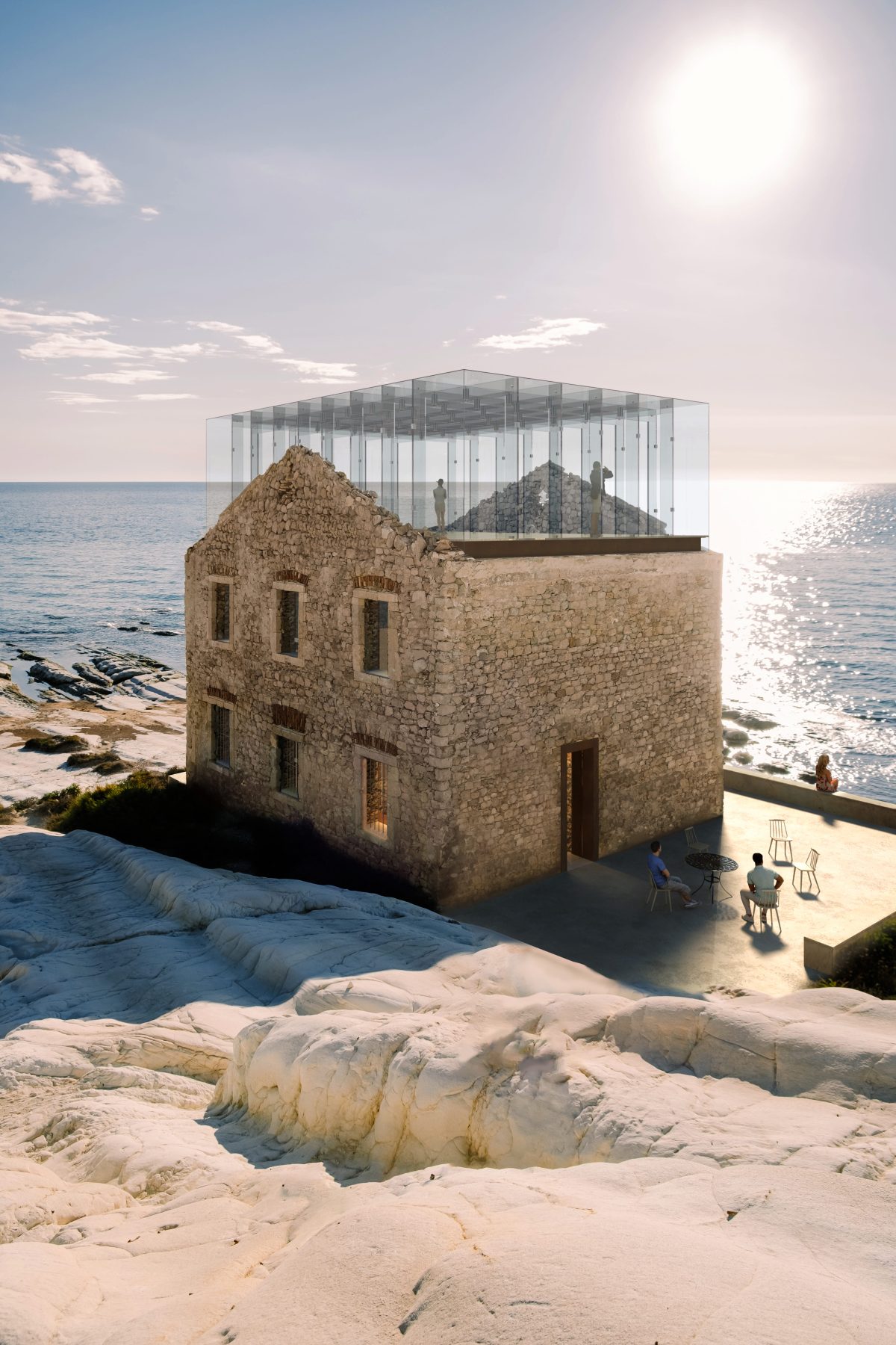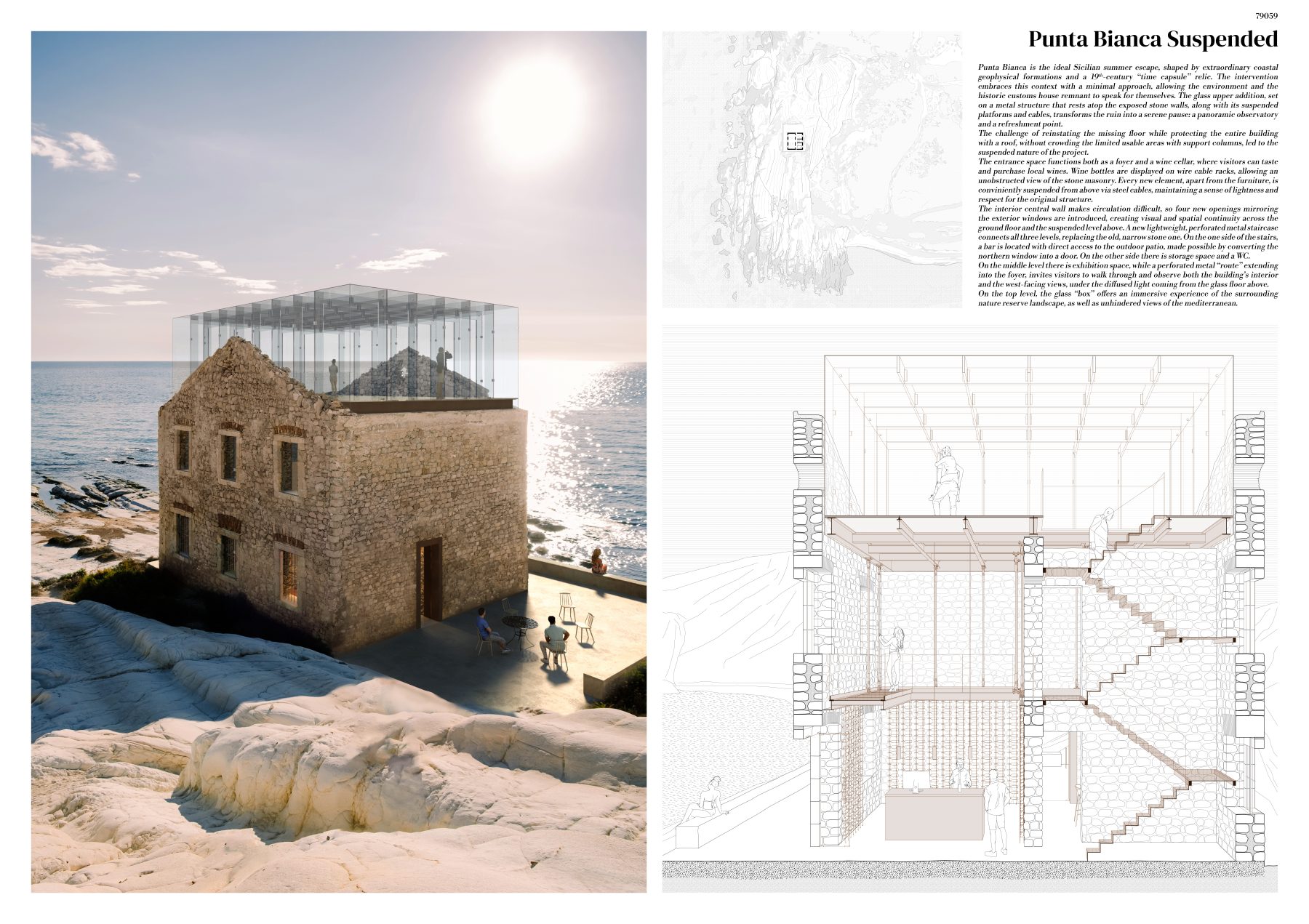 George Genovezos’ proposal for the ‘Punta Bianca’ Architectural Competition concerns an architecture of adaptive reuse. The project invites the visitor to observe both the ruin and the surrounding natural landscape, drawing inspiration from the concepts of lightness and suspension. The design focuses on the building, choosing glass and metal as the primary materials, while the exterior landscape is deliberately left untouched.