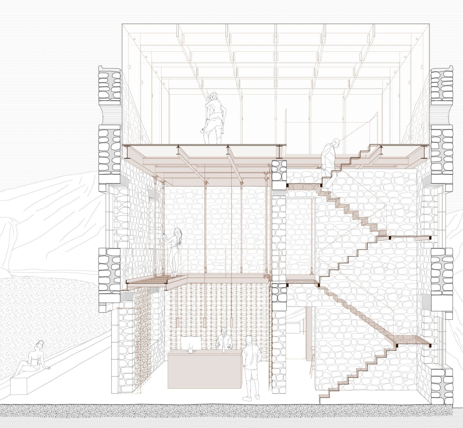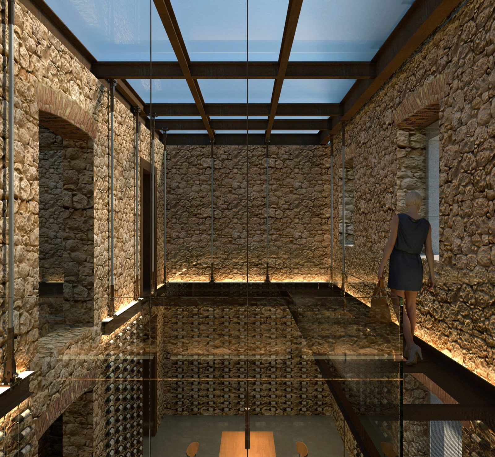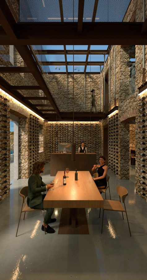The entrance space functions both as a foyer and a wine cellar, where visitors can taste and purchase local wines. Wine bottles are displayed on wire cable racks, allowing an unobstructed view of the stone masonry. Every new element, along with the lighting, and excluding the furniture, is conveniently suspended from above via steel cables, maintaining a sense of lightness and respect for the original structure.