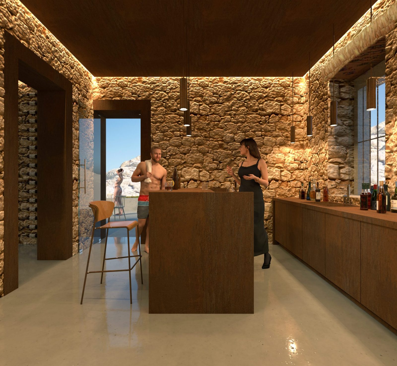 On the one side of the stairs, a bar is located with direct access to the outdoor patio, made possible by converting the northern window into a door. On the other side there is storage space and a WC.