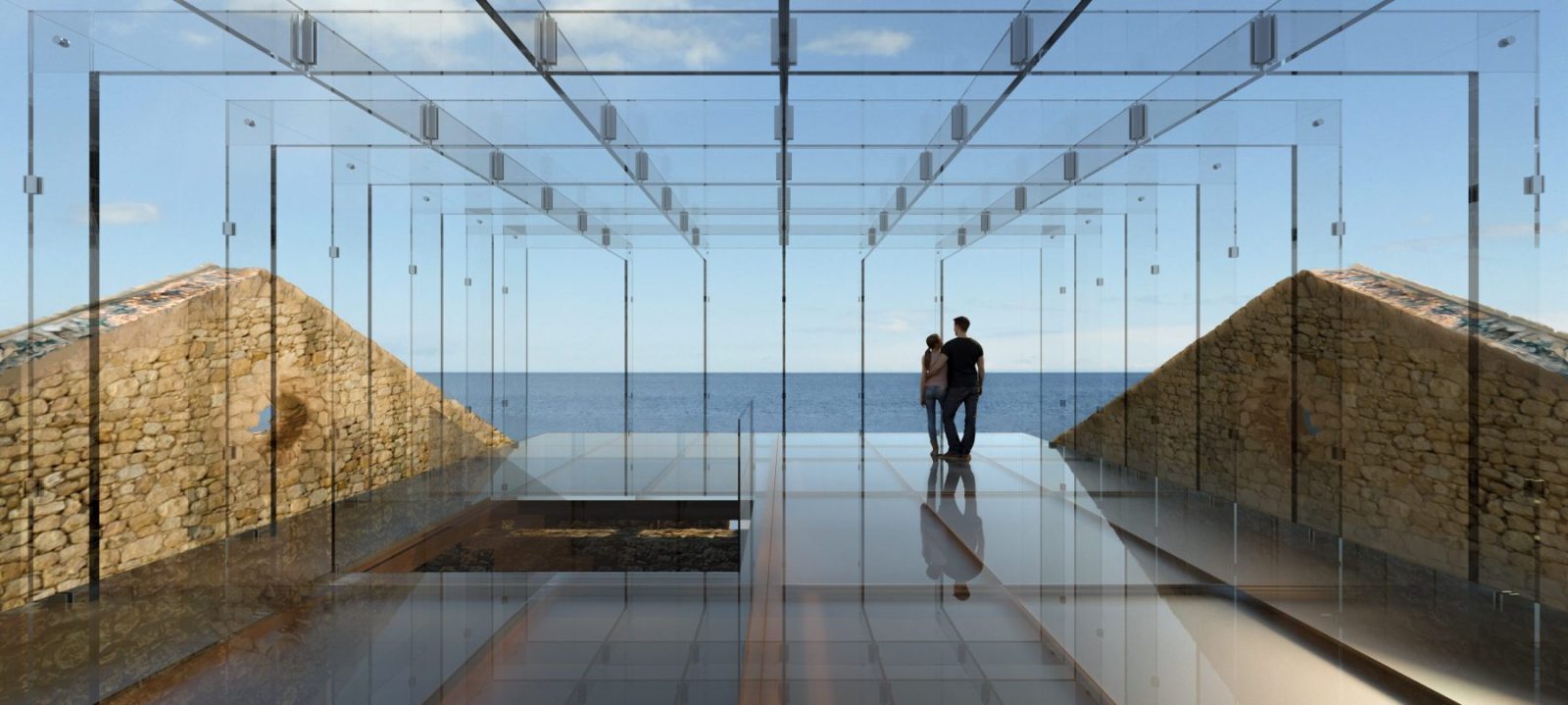 On the top level, the glass “box” offers an immersive experience of the surrounding nature reserve landscape, as well as unhindered views of the mediterranean. Its framing is constructed with glass columns and beams to further enhance the sense of transparency.
