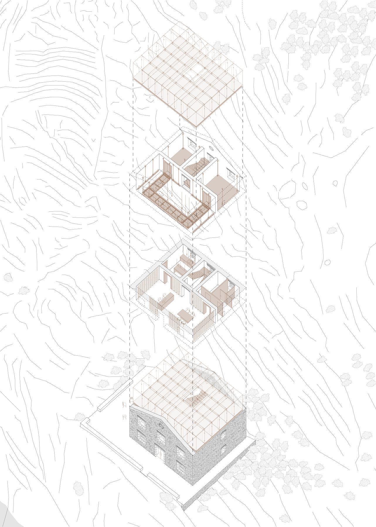 The challenge of reinstating the missing floor while protecting the entire building with a roof, without crowding the limited usable areas with support columns, led to the suspended nature of the project.