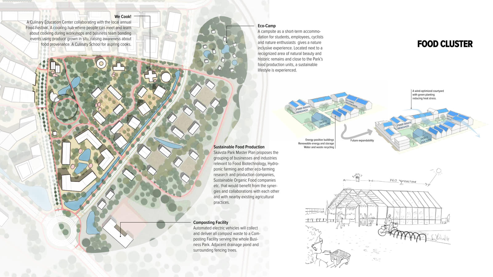 The proposed masterplan at Skavsta featured interconnected ecosystems prioritizing sustainable practices in energy, material, and food production, supported by infrastructure that champions pedestrian-centric, car-free living.